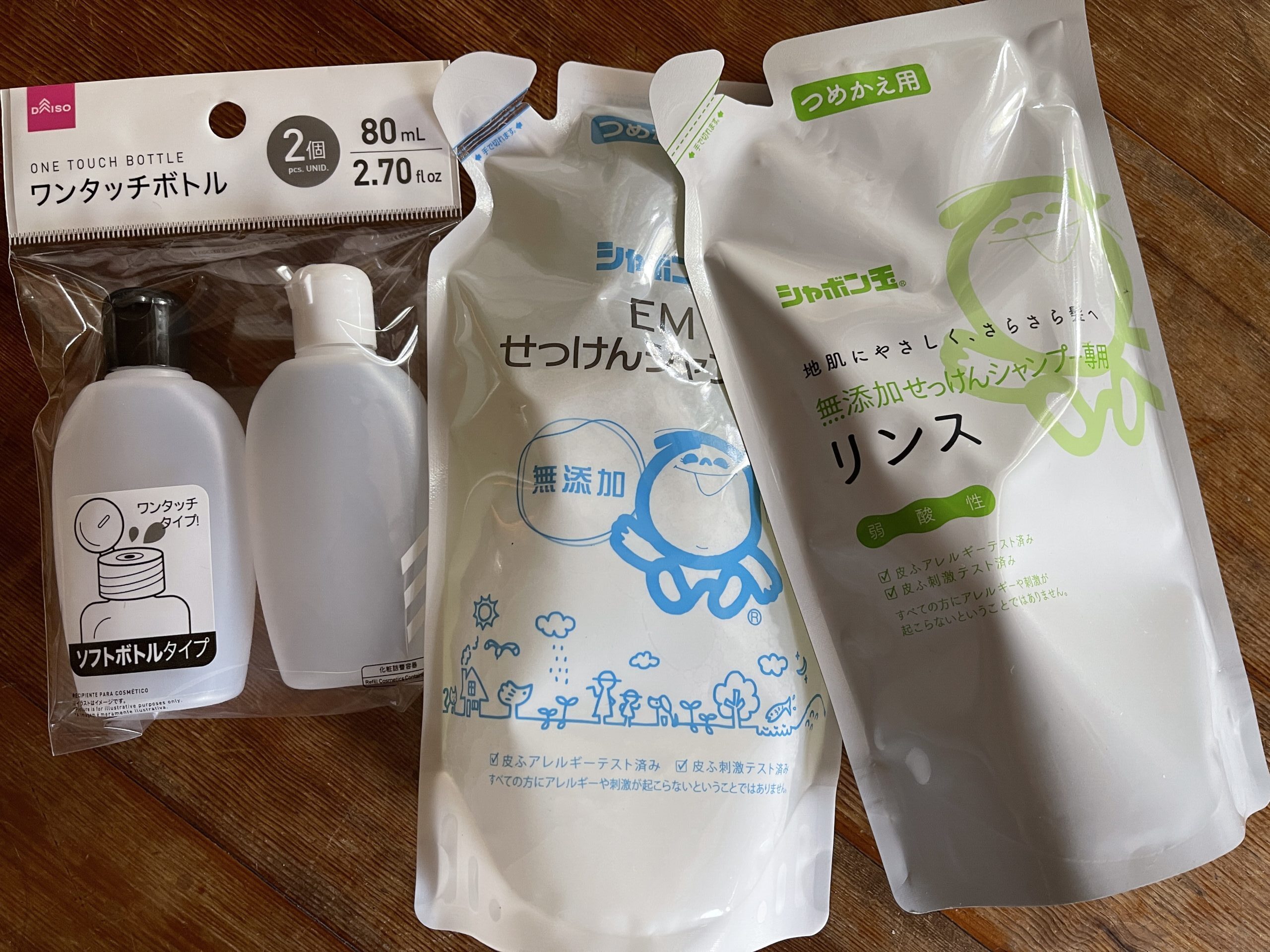 今までのセットには、ティッシュ1袋、おしりふき1袋まるまる、家で使ってるシャンプーとリンスと子供用の体も髪の毛も洗えるアワアワボディソープなどなど、旅行前にとりあえず家にあるものを詰めて持っていくスタイルで、これはこれで楽だったのですが。軽キャンにはデカい。