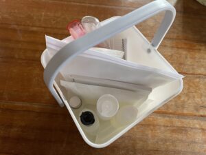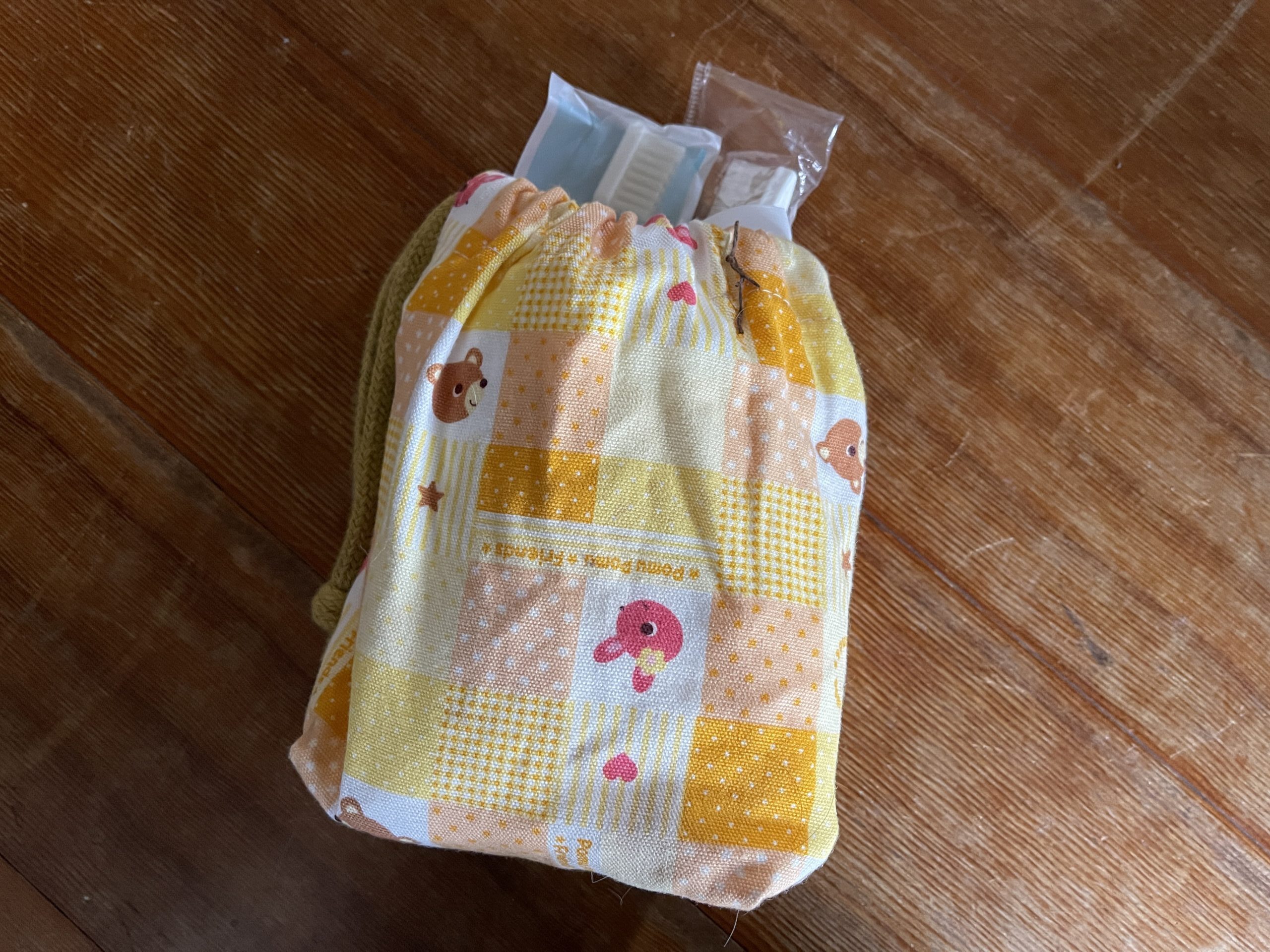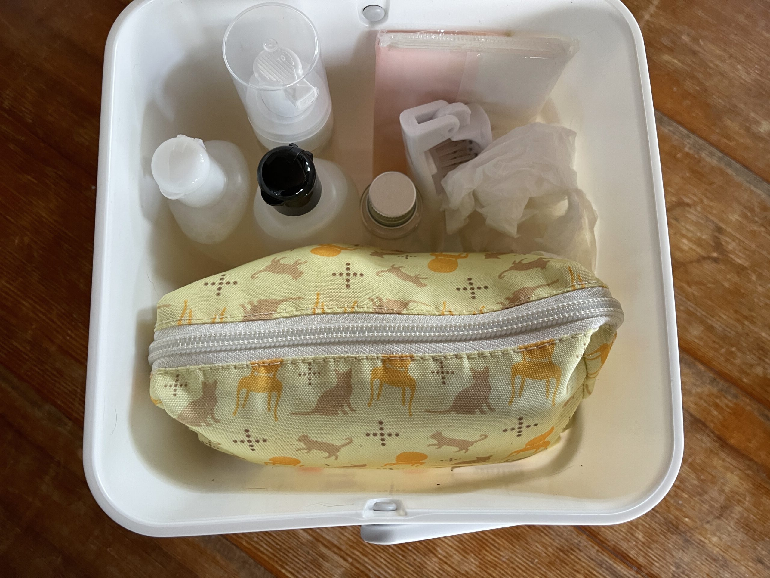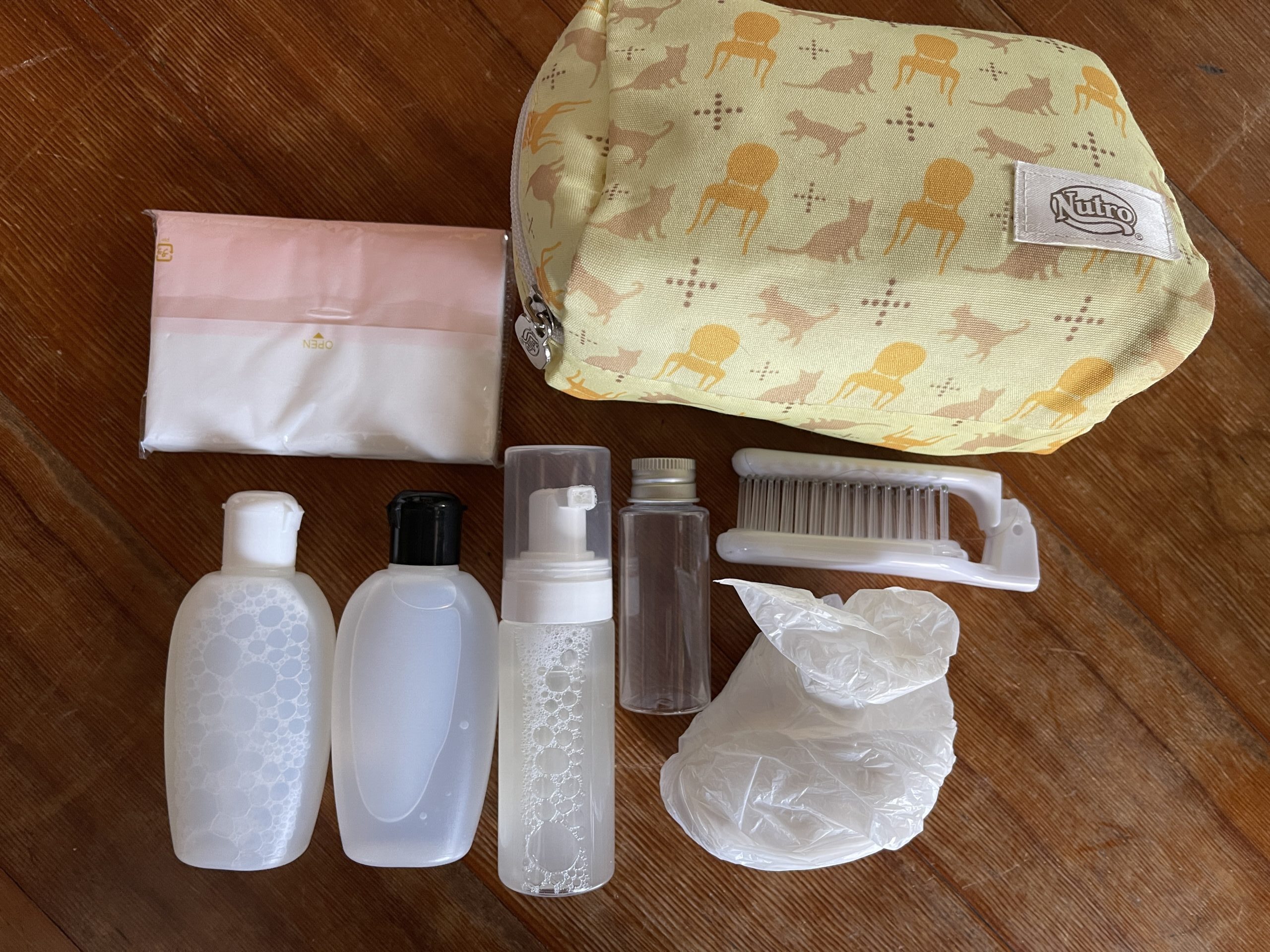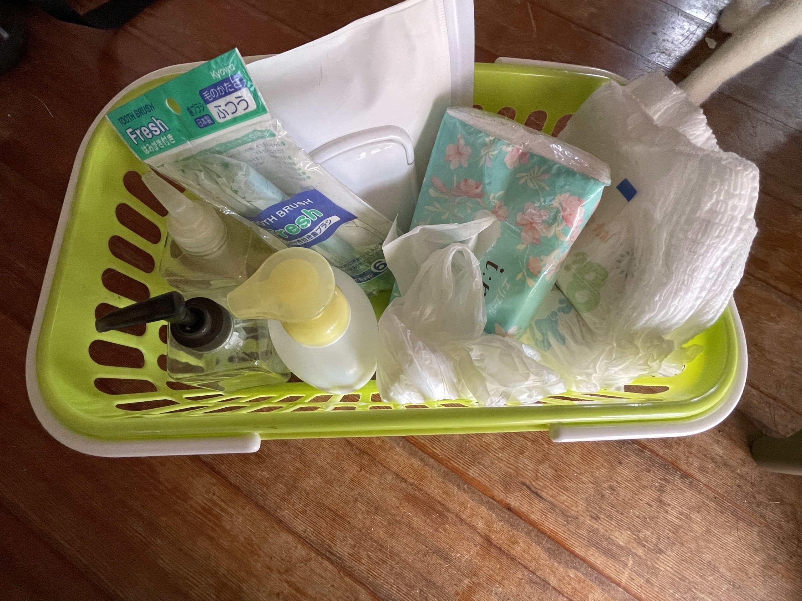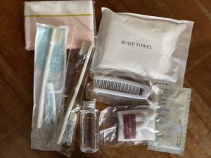 あと、ついでに家にあったホテルとかに泊まった時にもらえるアミニティグッズを集めて、歯ブラシ、ティッシュ、タオル、ブラシ、化粧水、ヘアゴム、髪にも使える全身ボディソープ。