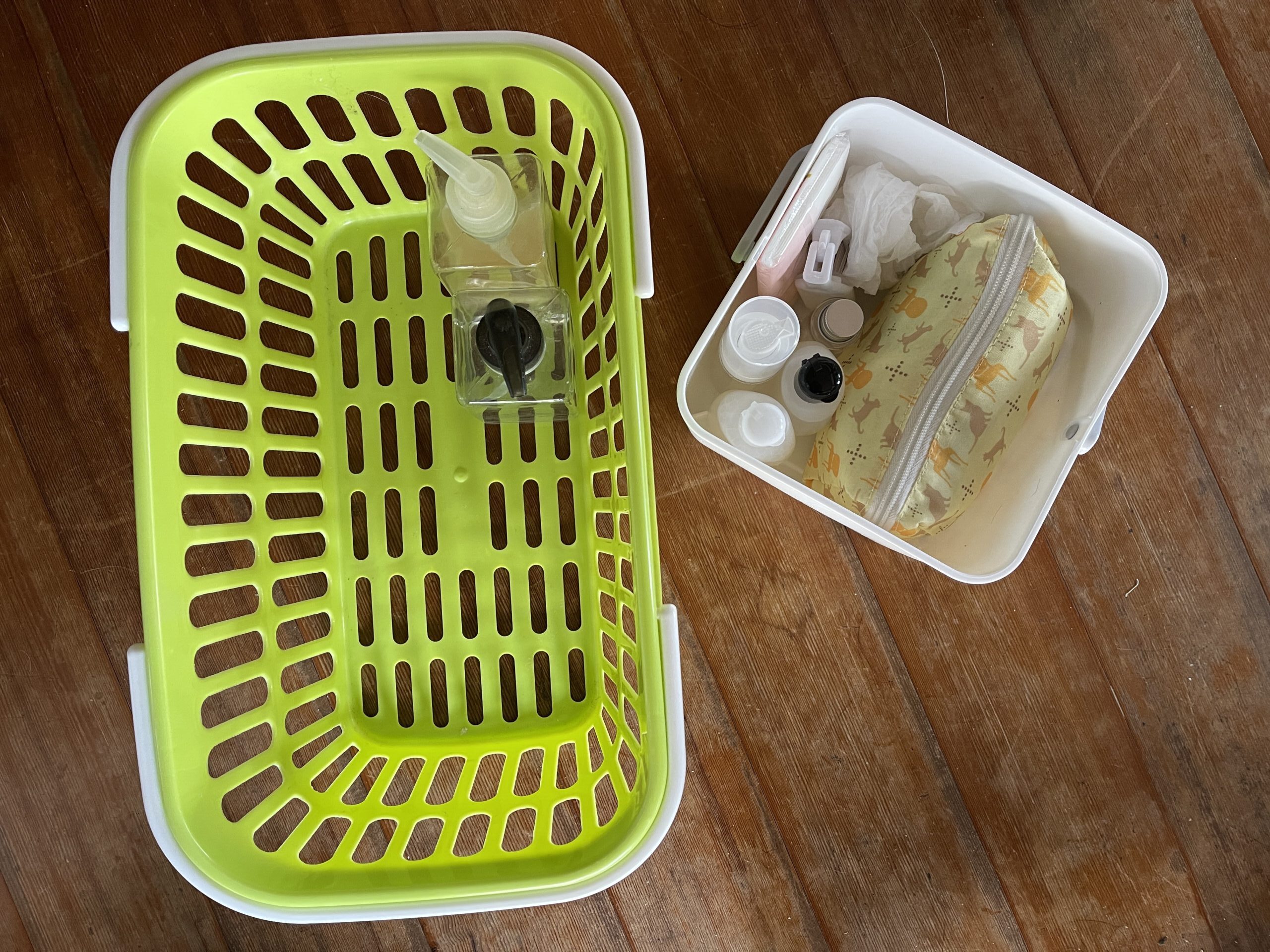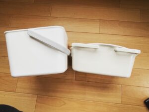 今までお風呂セットで使ってたプラカゴなんですが、息子もオムツを卒業しましたし、大きすぎるなとなり、この度コンパクト化を図ることにしました。
