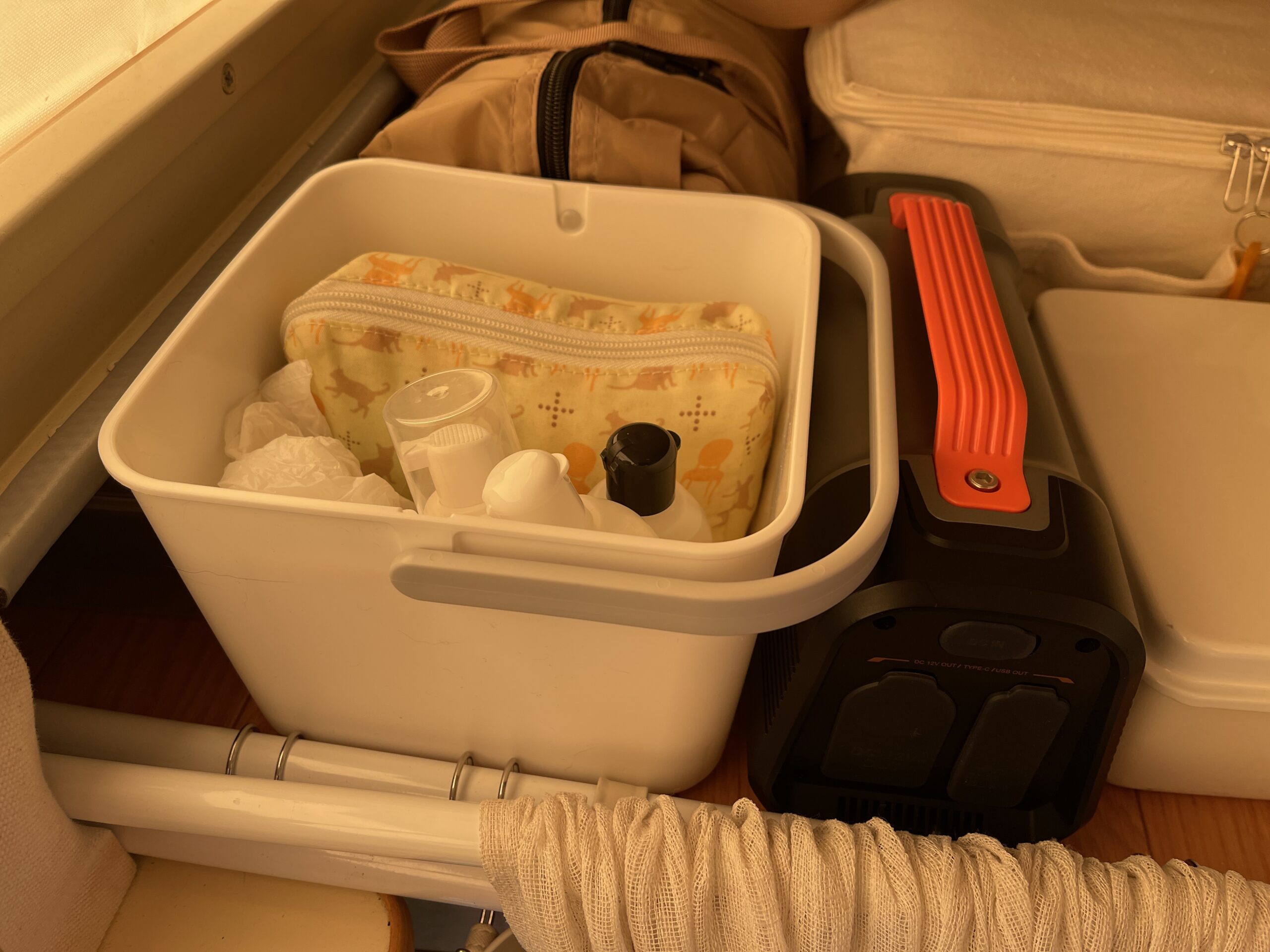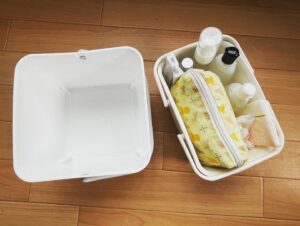 そこに、ポケットティッシュ、シャンプーとリンス、ボディソープ(泡プッシュ)、化粧水(食品ボトル)ヘアブラシ、ゴミ袋、生理用品(災害用も兼ねて1週間分)を収納。