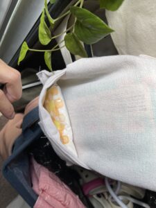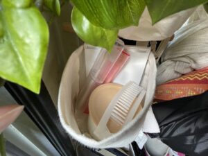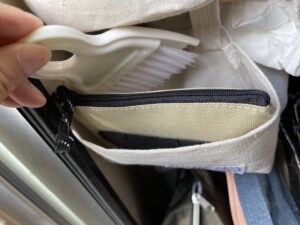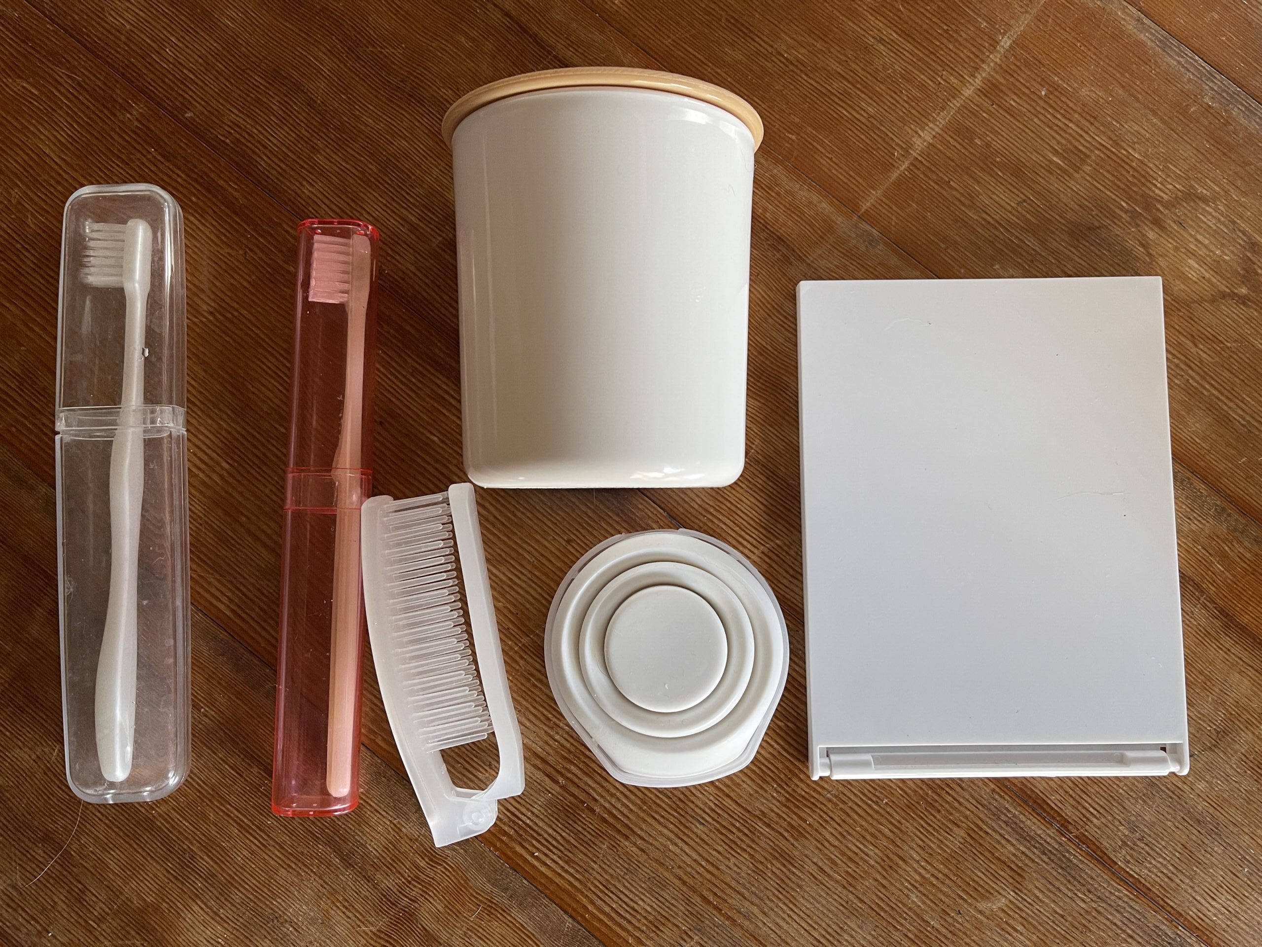 私と子供の歯ブラシ(ケース入り)、髪の毛のブラシと手かがみ、シリコンの折りたたみミニコップ(今気づいたんですけど、ミニコップは息子と自分のと分けたほうが良いかもですね。ついつい同じのを使い回していました)と、密閉できるプラ容器