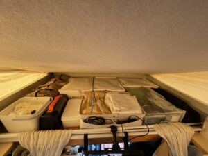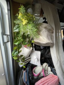 我が家の軽キャン、吊り下げ収納、バンク収納、前席シート後ろの収納だけでかなりの物量になってます。