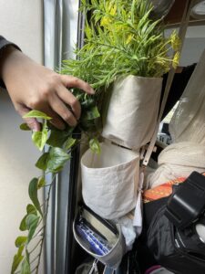 入り口付近に100均で揃えた3段の吊り下げ収納になっている2段目。