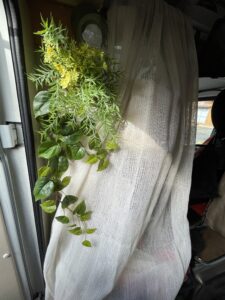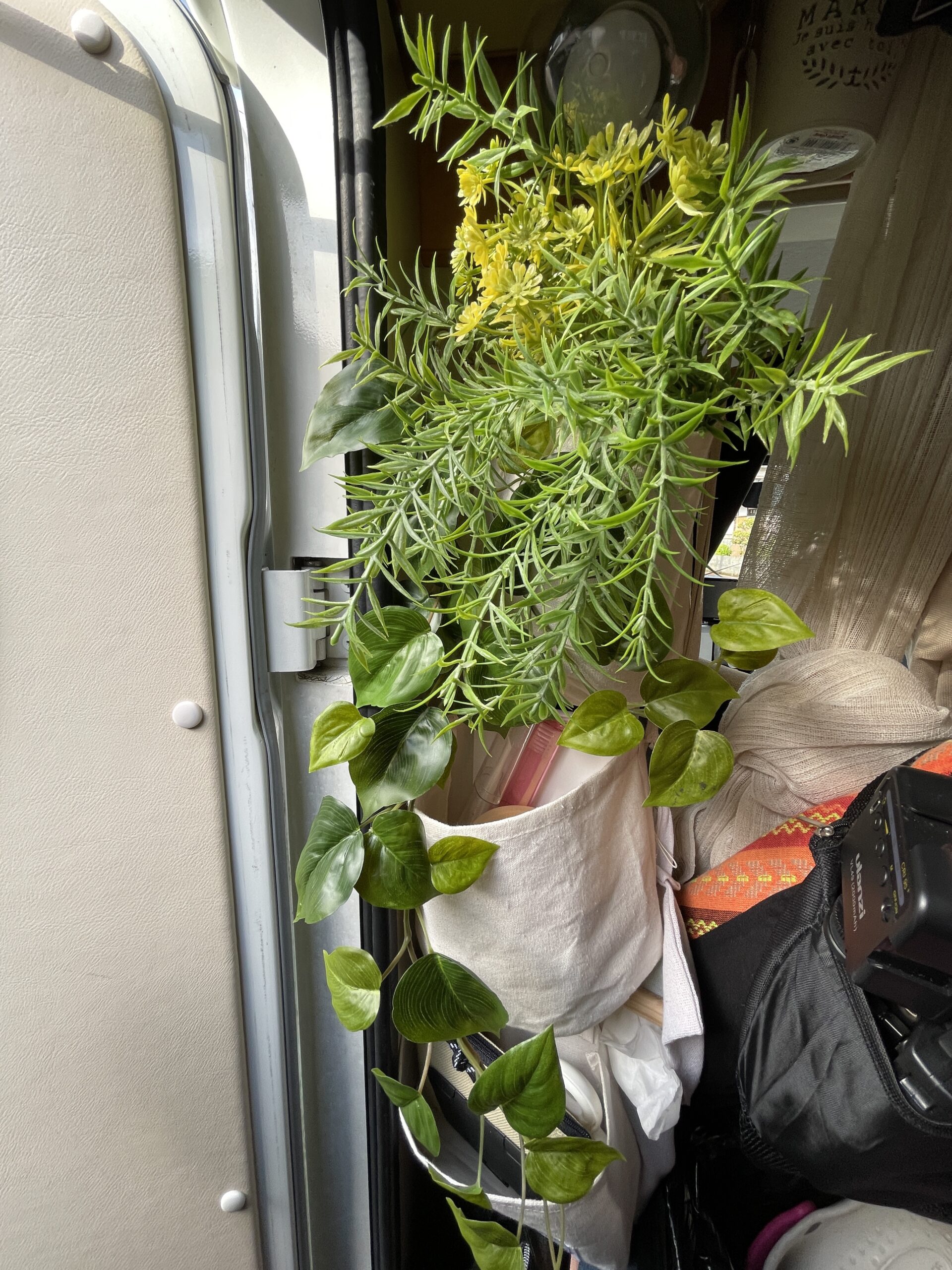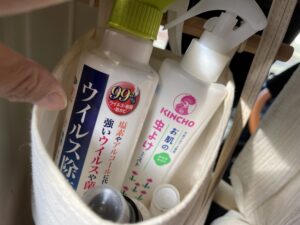 三段の一番上の収納には、除菌(ウイルス除去か)のスプレー、虫除けスプレー、日焼け止めスプレーなど、スプレー類がまとまってます。ここにフェクグリーンをブッ刺して車内の彩りにしてます。