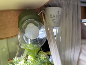 三段収納の一番上にはLEDランタンが吊ってて、その隣にクリップ入れのミニバケツもありますね。ここ本当にゴチャゴチャ、ギッシリしてます。