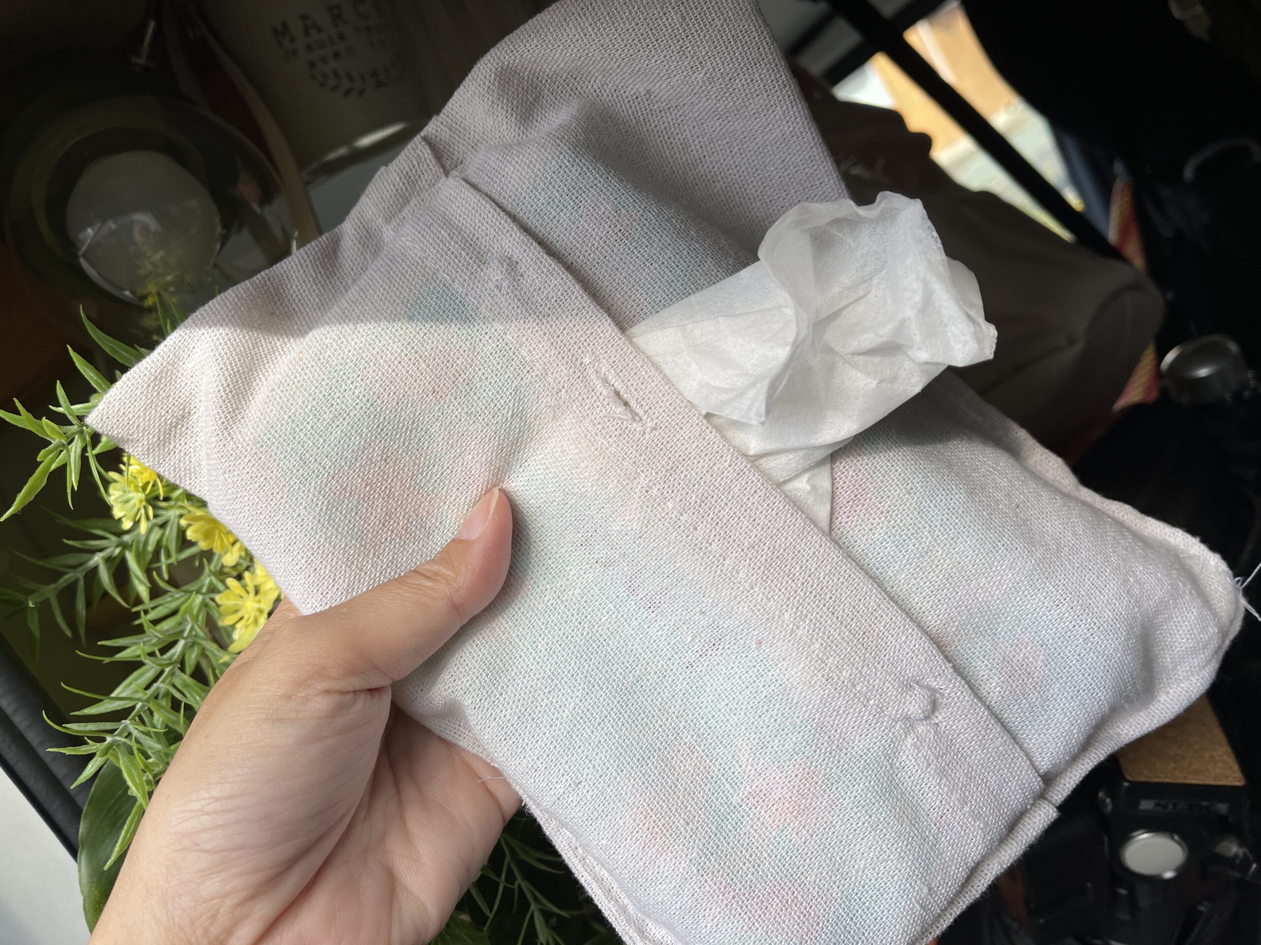あと、セリアで買ったけどデカ過ぎたから自分でミシンで小さめに折り曲げて、後ろにポケットティッシュを収納もできるようにカスタムしたティッシュ入れを、同じくセリアのストラップで吊り下げてます。