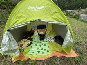 気にする人は、トイレに使うテントを食事でも使うなんて・・・と思う方もいらっしゃるかもしれませんが、例えば専用のレジャーシートを敷いて使うなどしたら私は気になりません。それより便利さが先に立ちます(笑)