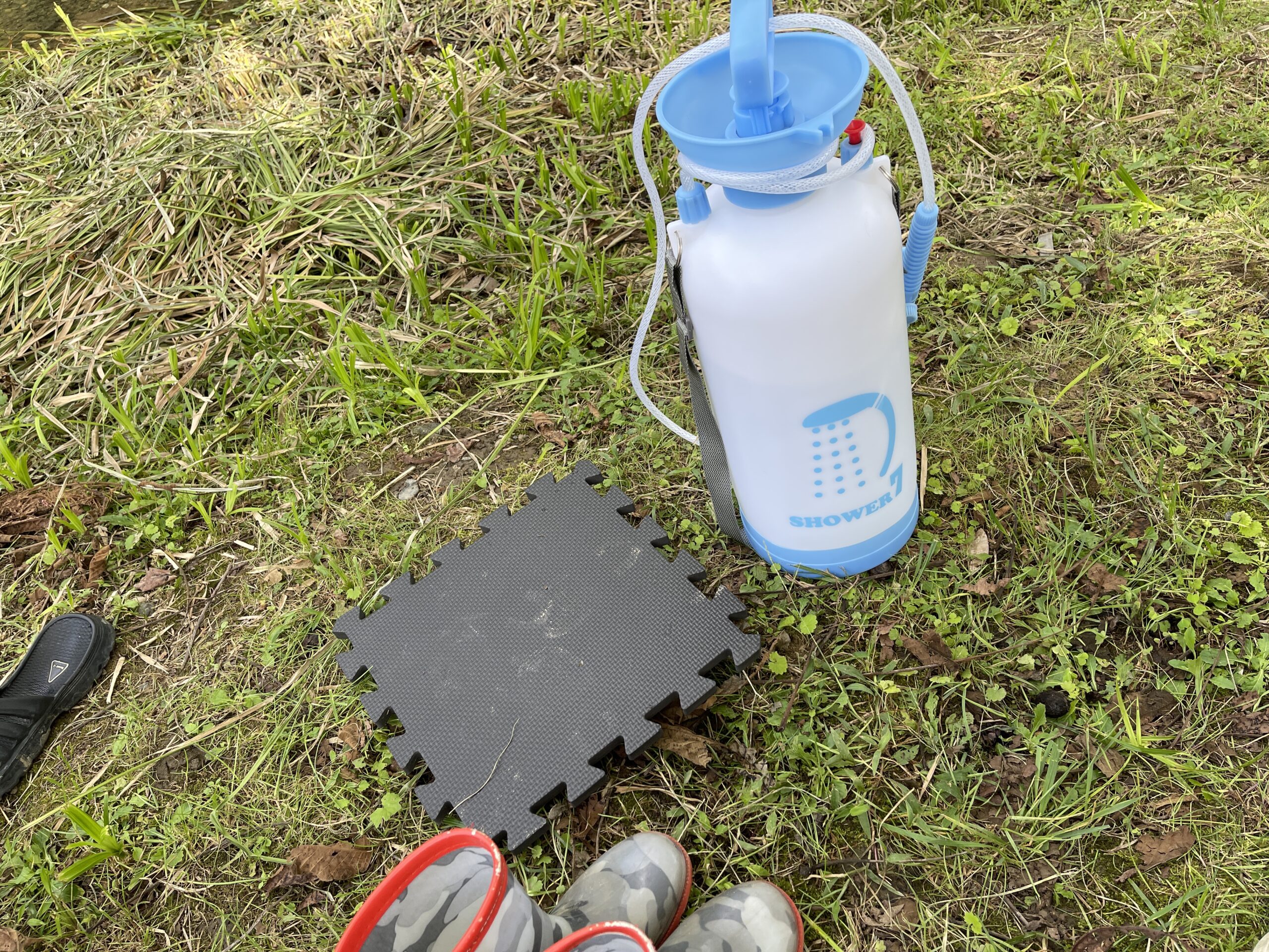 うちもポータブルシャワーを持っていて、海や川で遊ぶ時には、足場代わりのジョイントマットと一緒に使うんですが、主に足を洗ったり、海では子供を軽く洗うのに使ってます。