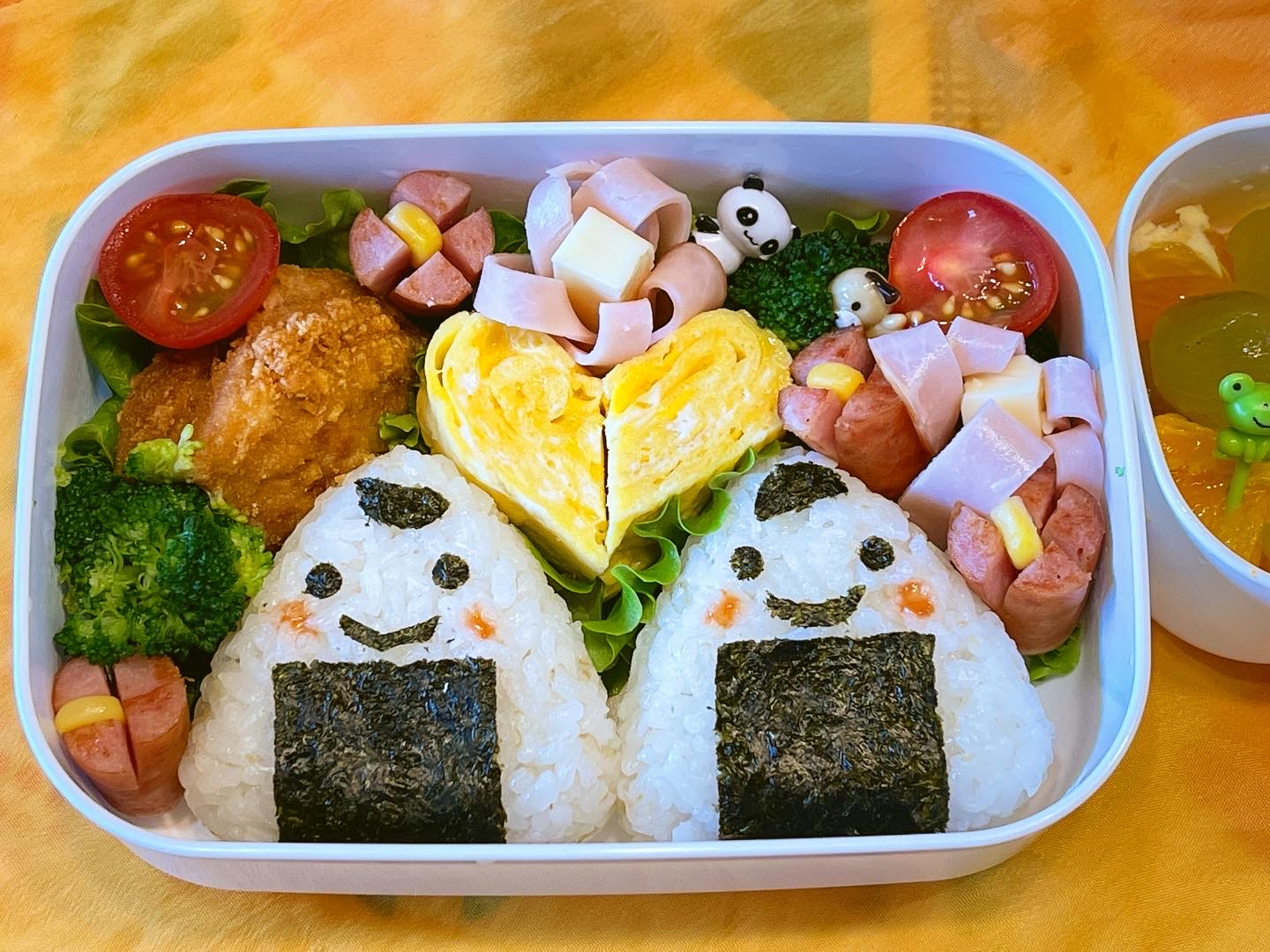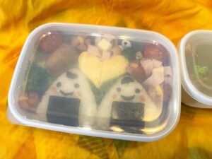 お友達の参考写真は、ネットでよくみる、おにぎり2つがニコニコして、真ん中に卵焼きのハートを配する、初心者向けかつ黄金の構成でした。