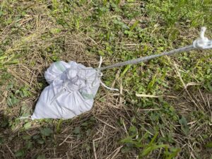 土嚢袋に適当に川の砂利などを詰めて、ロープで口を縛り、それをタープのロープの先端にくくります。