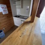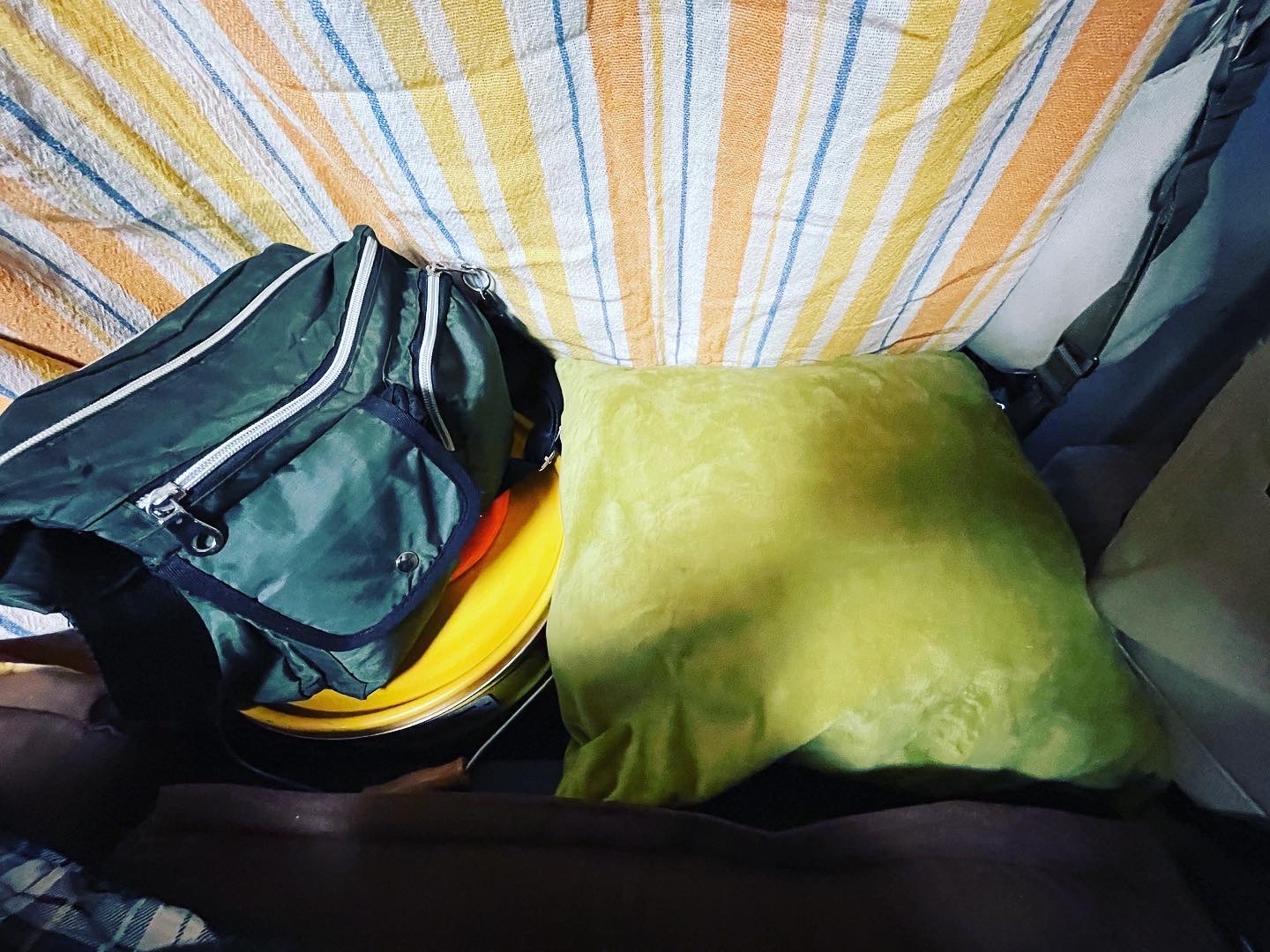 運転席の後ろは、飲み物専用のクーラーボックスの定位置となっていて、ここに厚めのクッションを載せることで運転席後ろのベッドスペースを最大200~210センチに延長できるようになっています。(運転席を前に倒せば200cm以上取れます。私は身長165cmくらいの女性なので、ただ寝るだけなら運転席は普段使いの角度のままでOKです)
