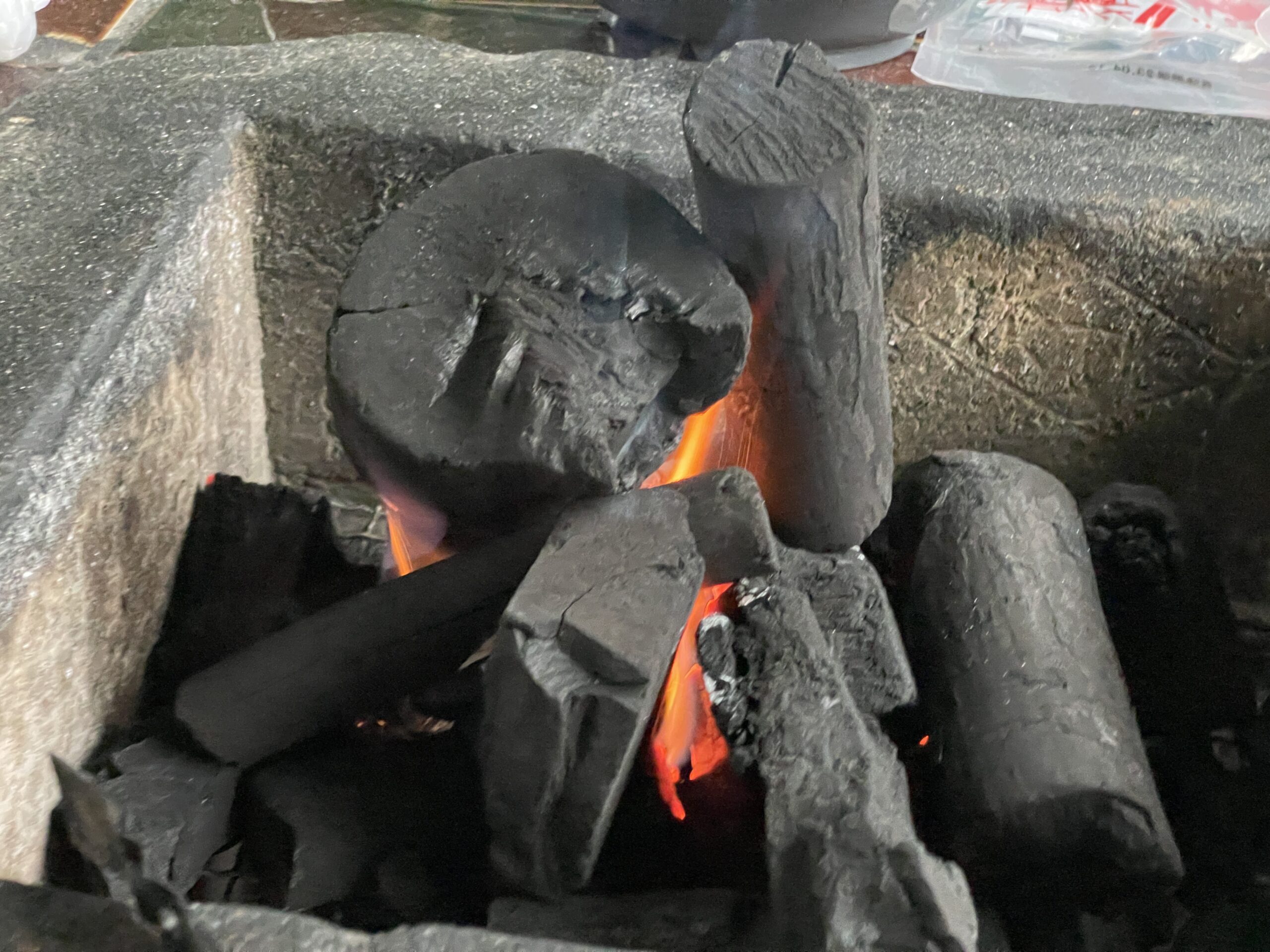 鍋にススがついて洗うのが大変になるし、別に炭火で煮てもガスで煮ても変わらないタイプの食材は素直にガスを使うようにしています。これも合理化を進めるママキャンの掟!