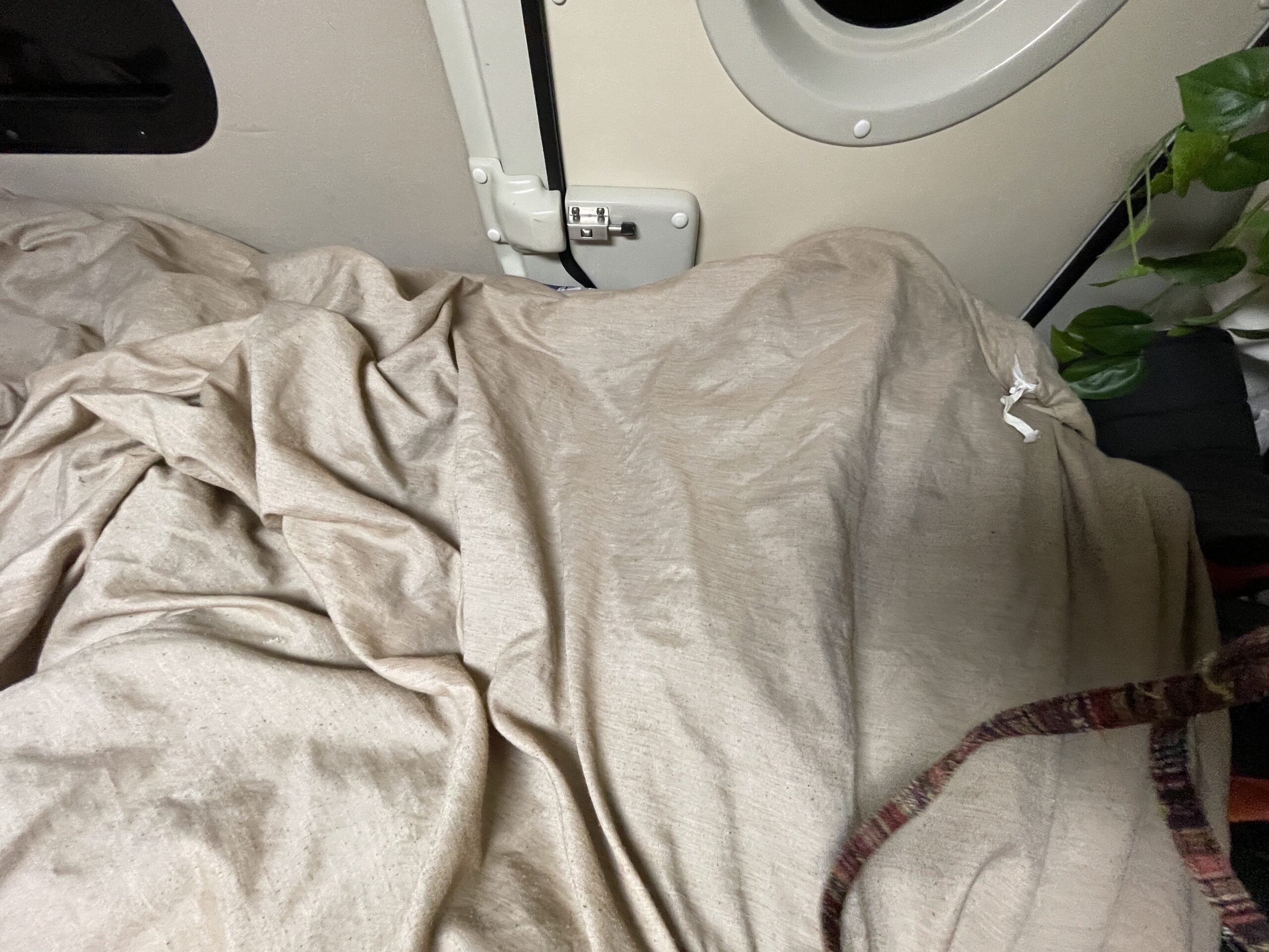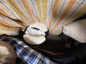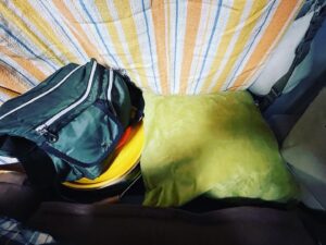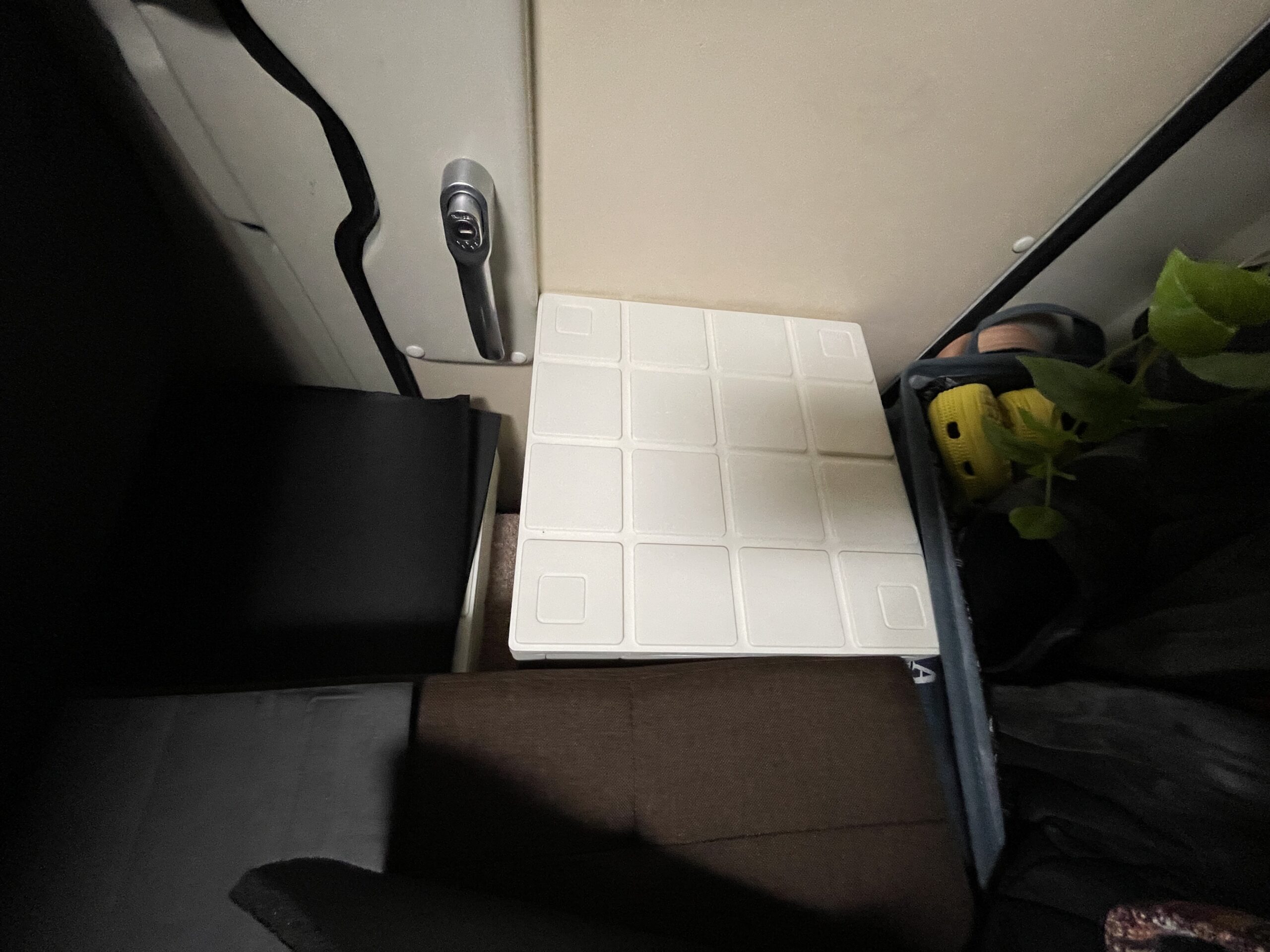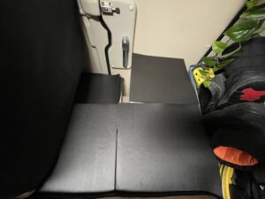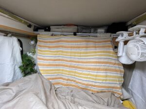 トイレを使用するときは、このクーラーボックスをどけて足を下に降ろすスペースを作り、運転席を前に倒します。カーテンはyoutubeでもご紹介していますが、適当な布を吊り下げているだけです