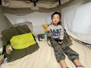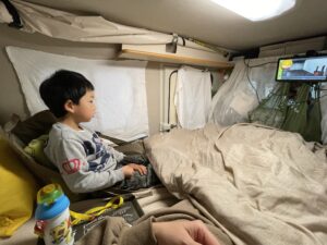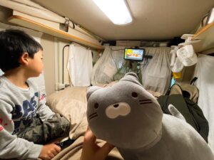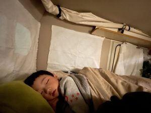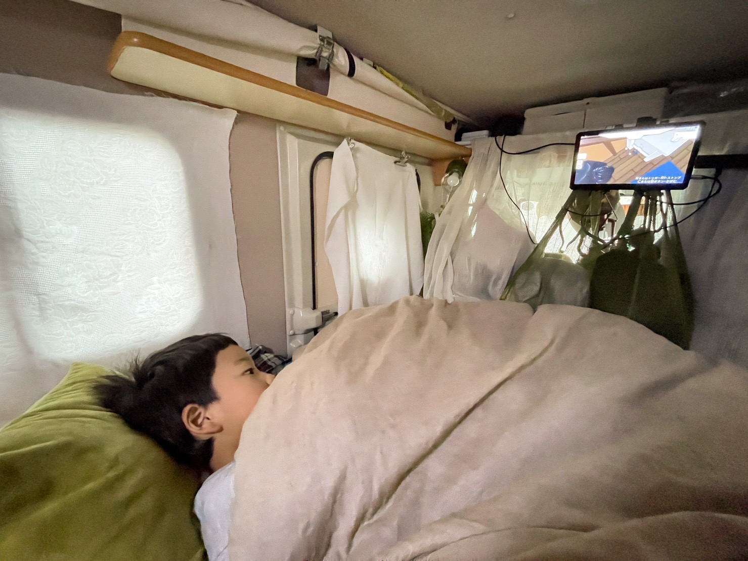 結局、永遠に「暫定版」と化している切りっぱなしの布のシェードと、吊り下げるだけの簡易カーテンで車内の目隠しをしたら、ちょうど9時を回っていたので息子くんは寝落ちしました。