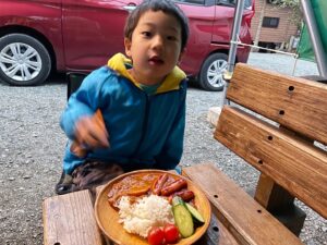 メインのBBQ台の机と椅子が完全に大人サイズで子供には大きかったので、テントむしからアウトドアチェアを出して、息子くんには椅子で食べてもらいました