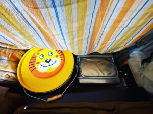 テントむしのドアノブはちょっと出っ張っているので、干渉しないようにコンテナを置くのがポイントになるんです。あと、息子くんはまだ身長が低いので、靴箱になってる助手席裏はそのまま靴箱を置いておいてもOKということがわかってきました(靴箱は移動ができるので、助手席のシート上に靴箱を移動させれば、助手席の後ろ側のベッドも190〜200cmの長さがとれます)