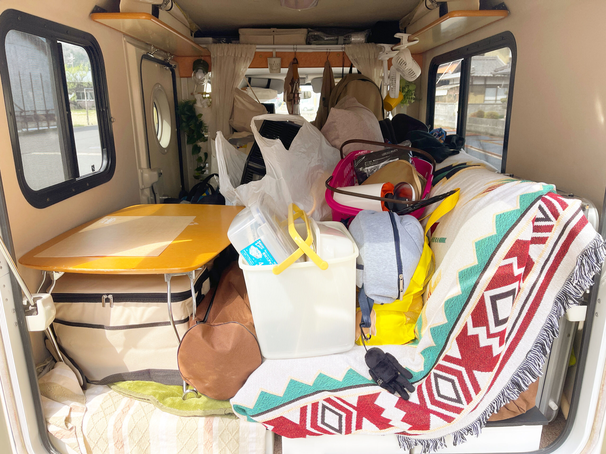 軽キャン「テントむし」の車内に、デイキャンプの道具を詰め込んで、