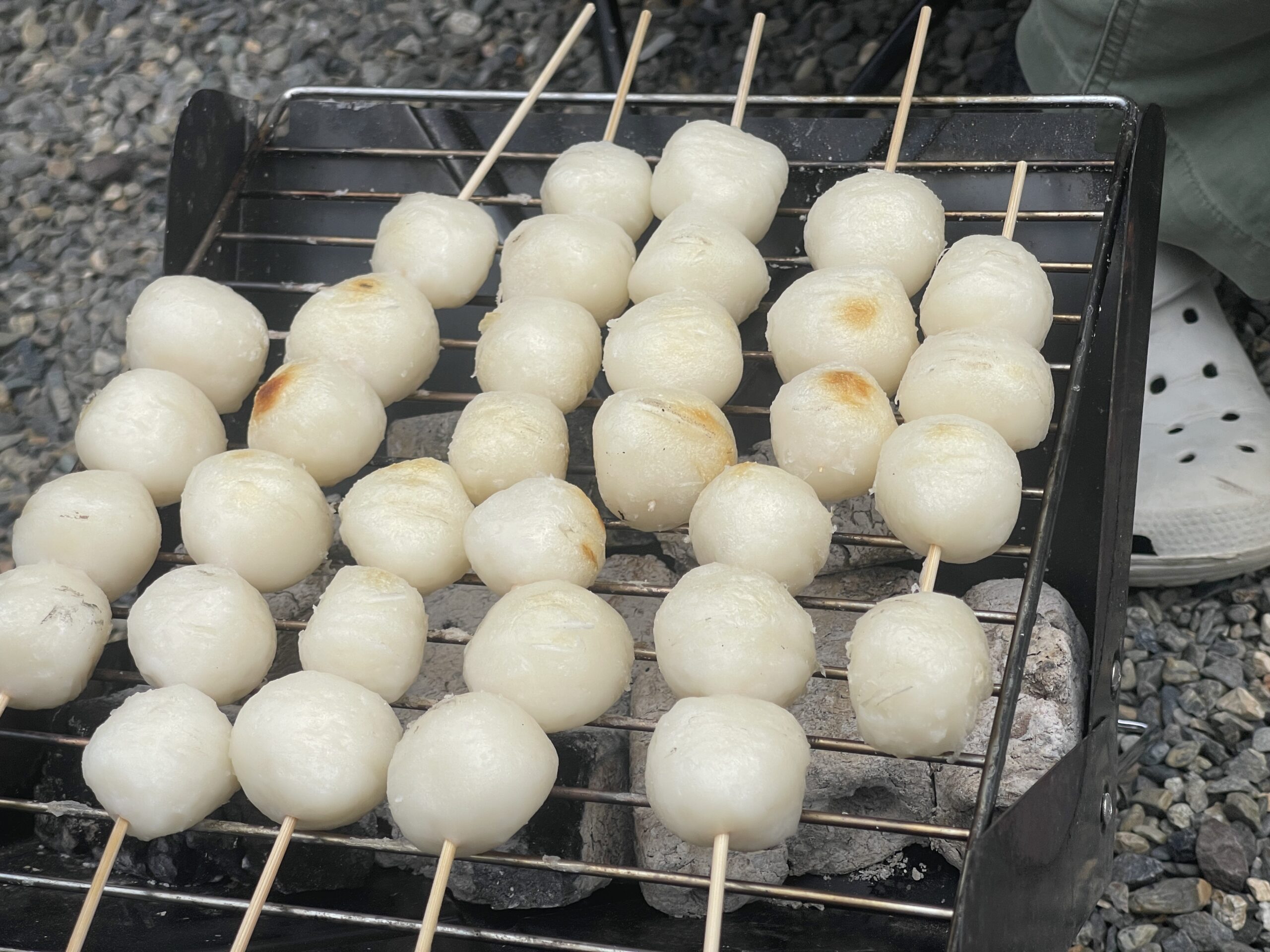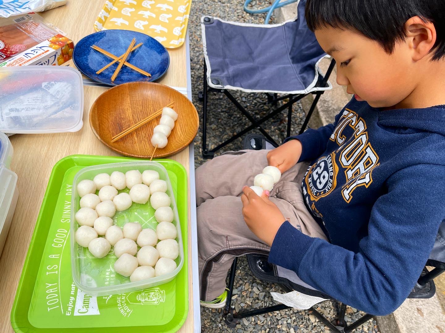 キャンプ場で子供たちに、自分で食べる分のだんごを串に刺してもらいます。