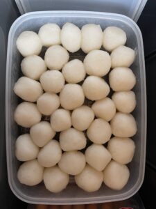 まず家で、だんごの粉1袋を、規定の水でこねて丸めてしっかり茹でます。