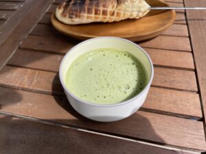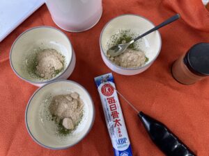 スキムミルクときび砂糖を入れて甘い抹茶ミルクにします