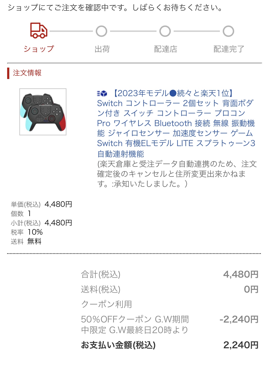 アマゾンだと1台3000円くらいのプロコンが2台セットで4500円、この時点でかなりお買い得ではあるんですが、ゴールデンウィークに最終日、なんと数量限定で半額セールしてたんですね