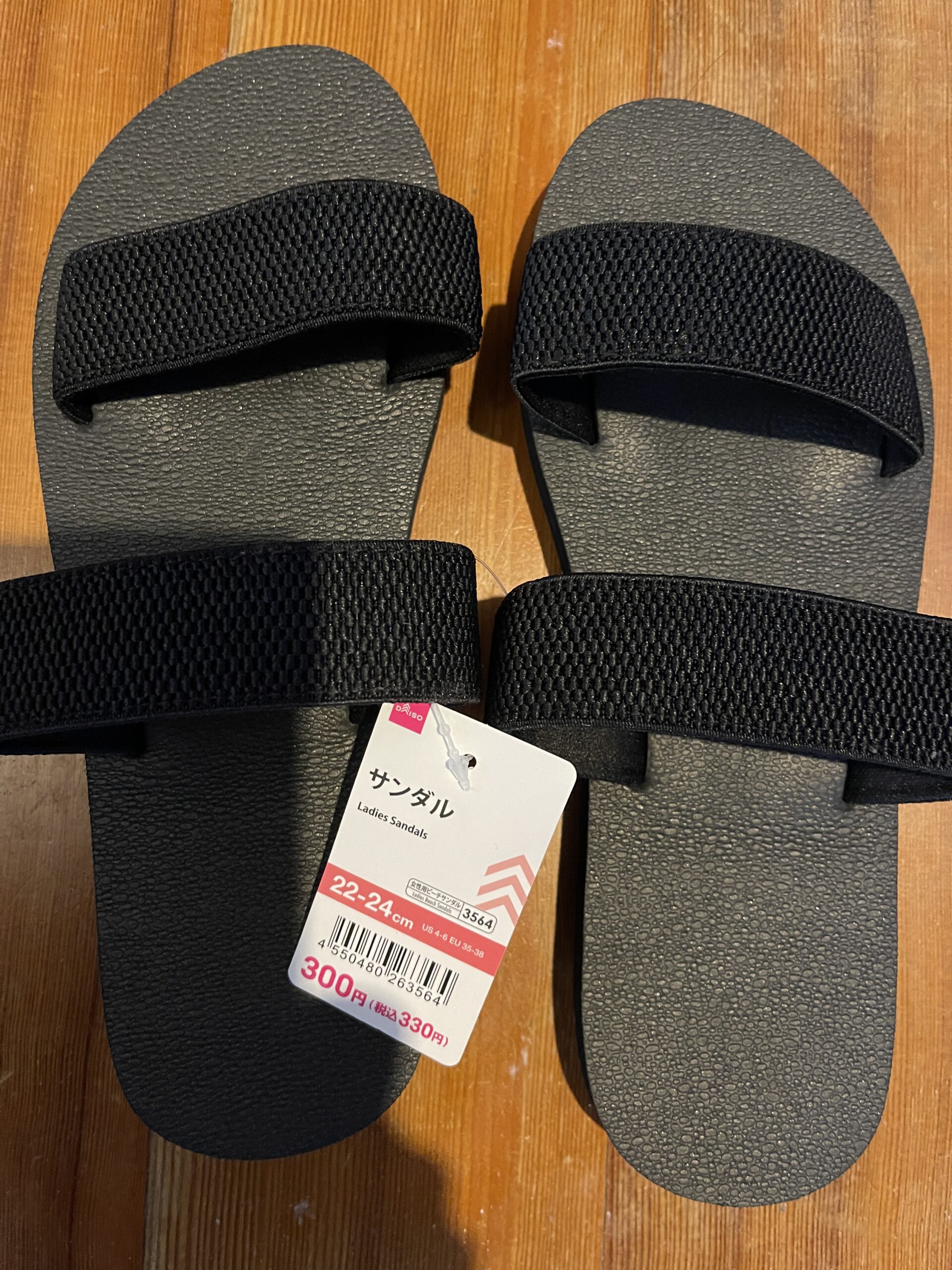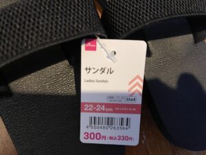 300円のサンダル。私の足は25cmくらいあるのでたいてい小さいんですが、これなら多少小さくても入るかなと思って購入しました