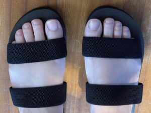 設営の時とかはしっかりした靴を履いてないと危ないですけど、あとはのんびりするだけになった時間は、サンダルに履き替えるとものすごく楽です。