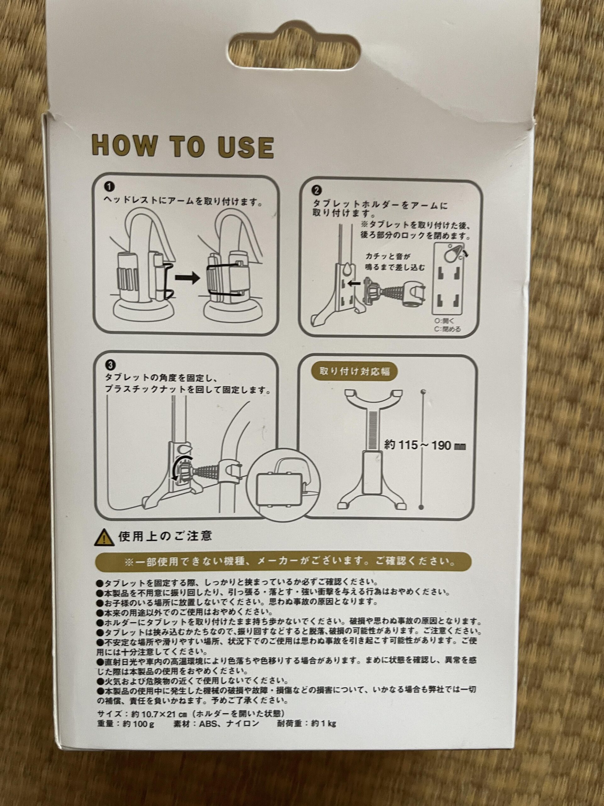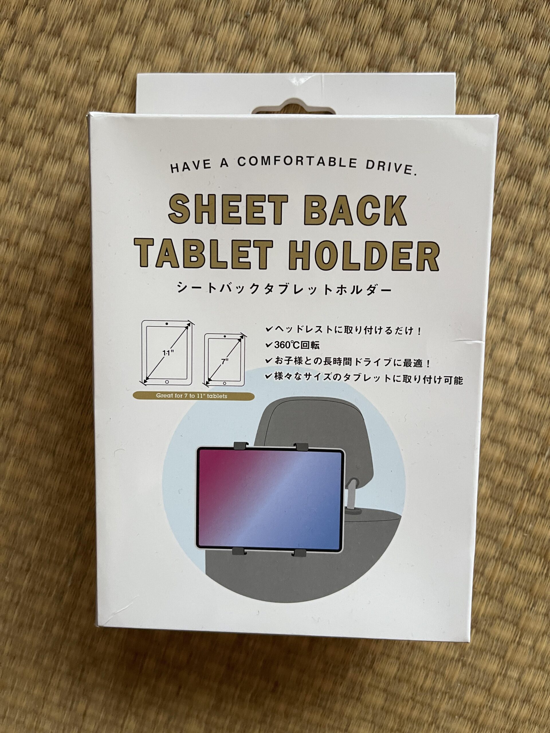こちらも3COINSの、シートバックタブレットホルダー(予備として購入しておいたもの)これでタブレットを固定します