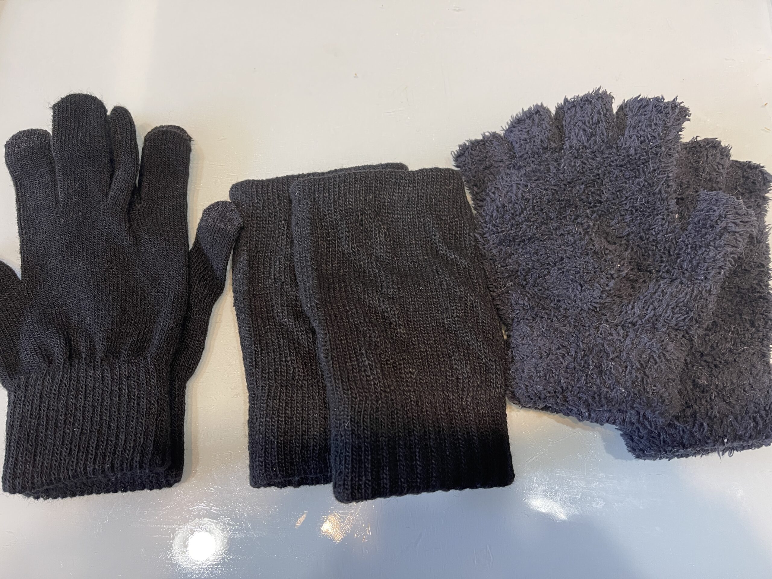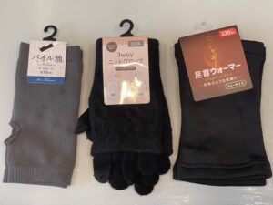 一番右側のモコモコ指なし手袋はセリアで以前購入したものです。