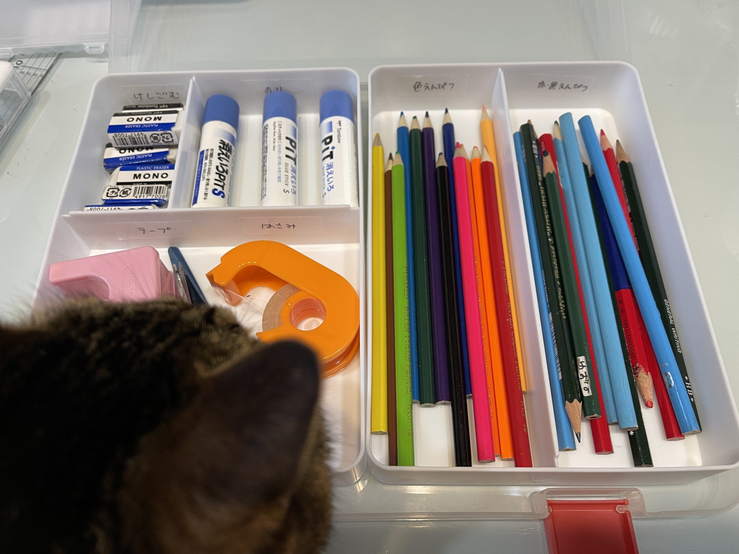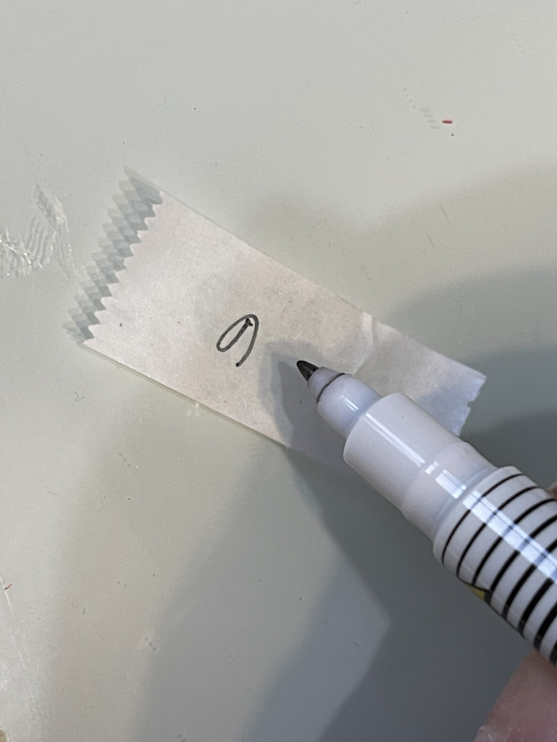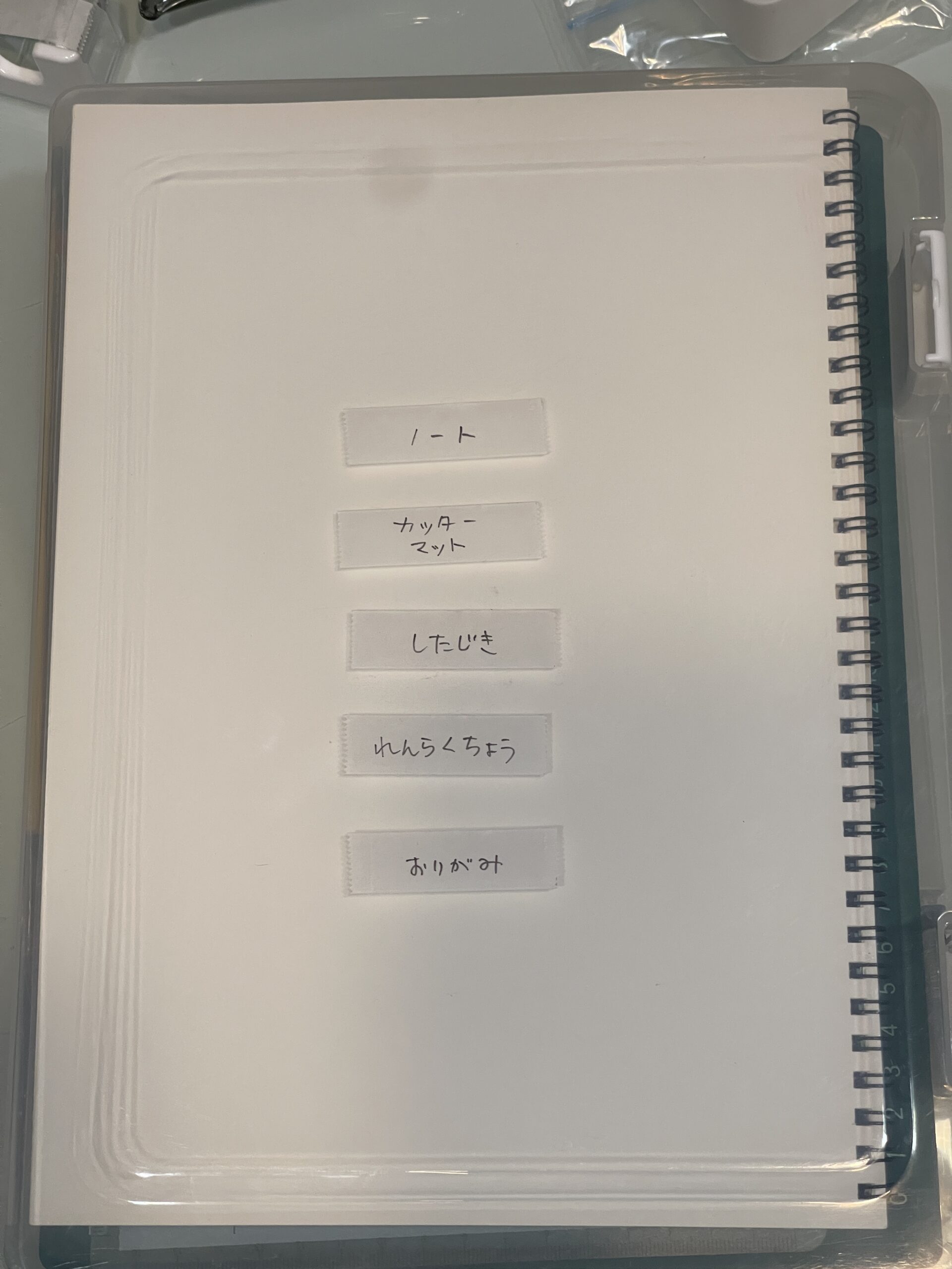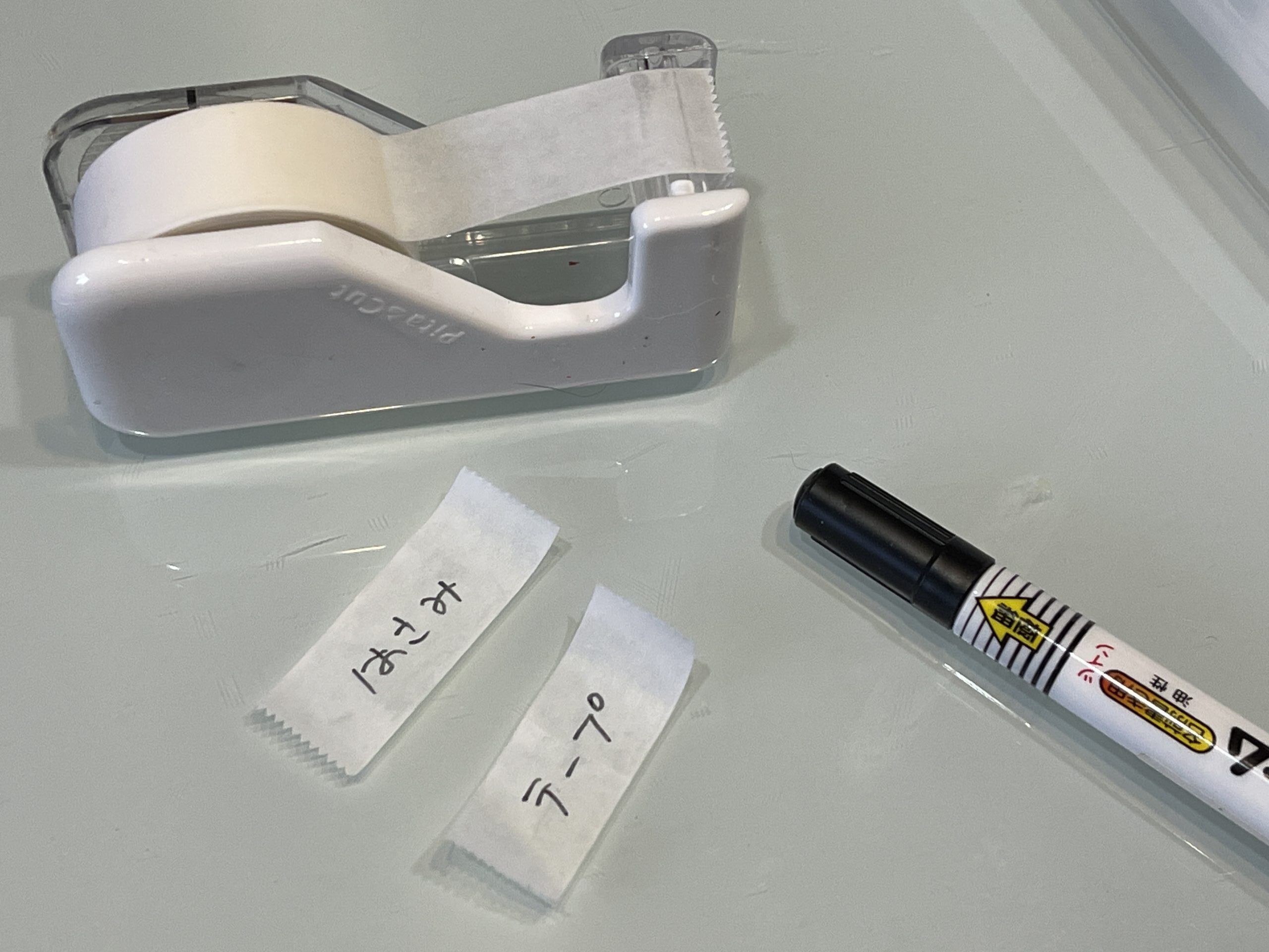 マステを適当な長さに切って、綺麗に拭いたテーブルに仮貼りして、ラベル名を書き込んで