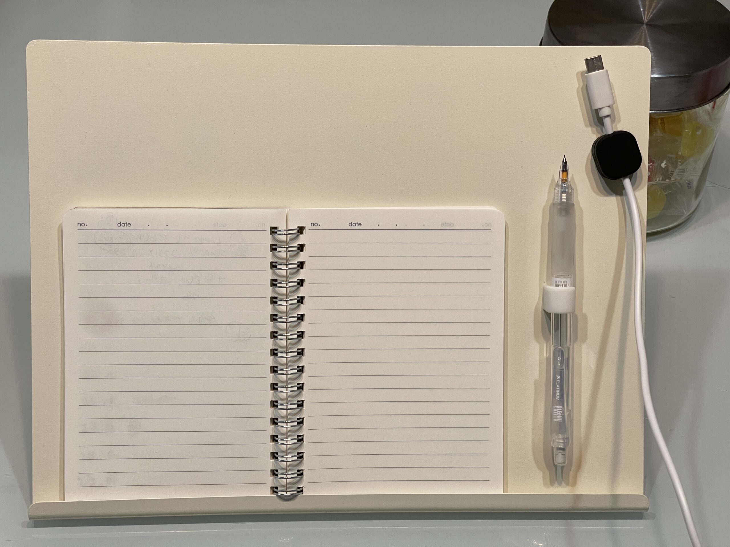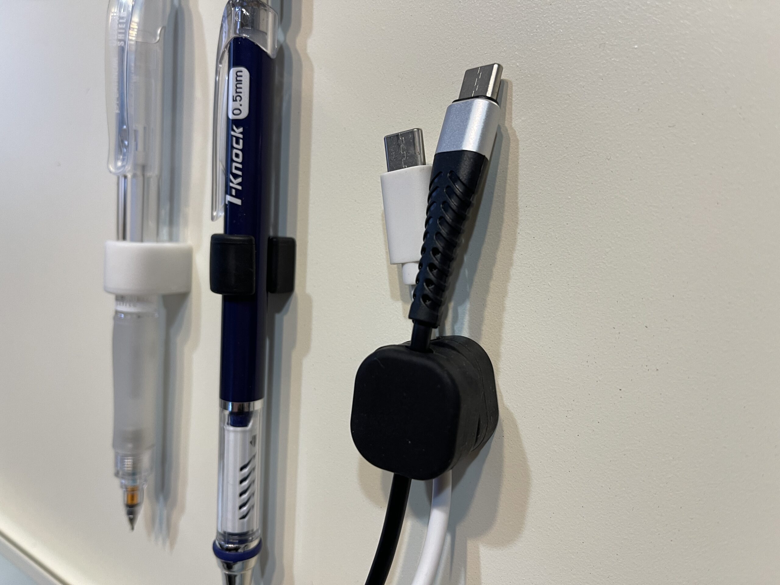 ペンとケーブルがスチールメモスタンドにくっつきました