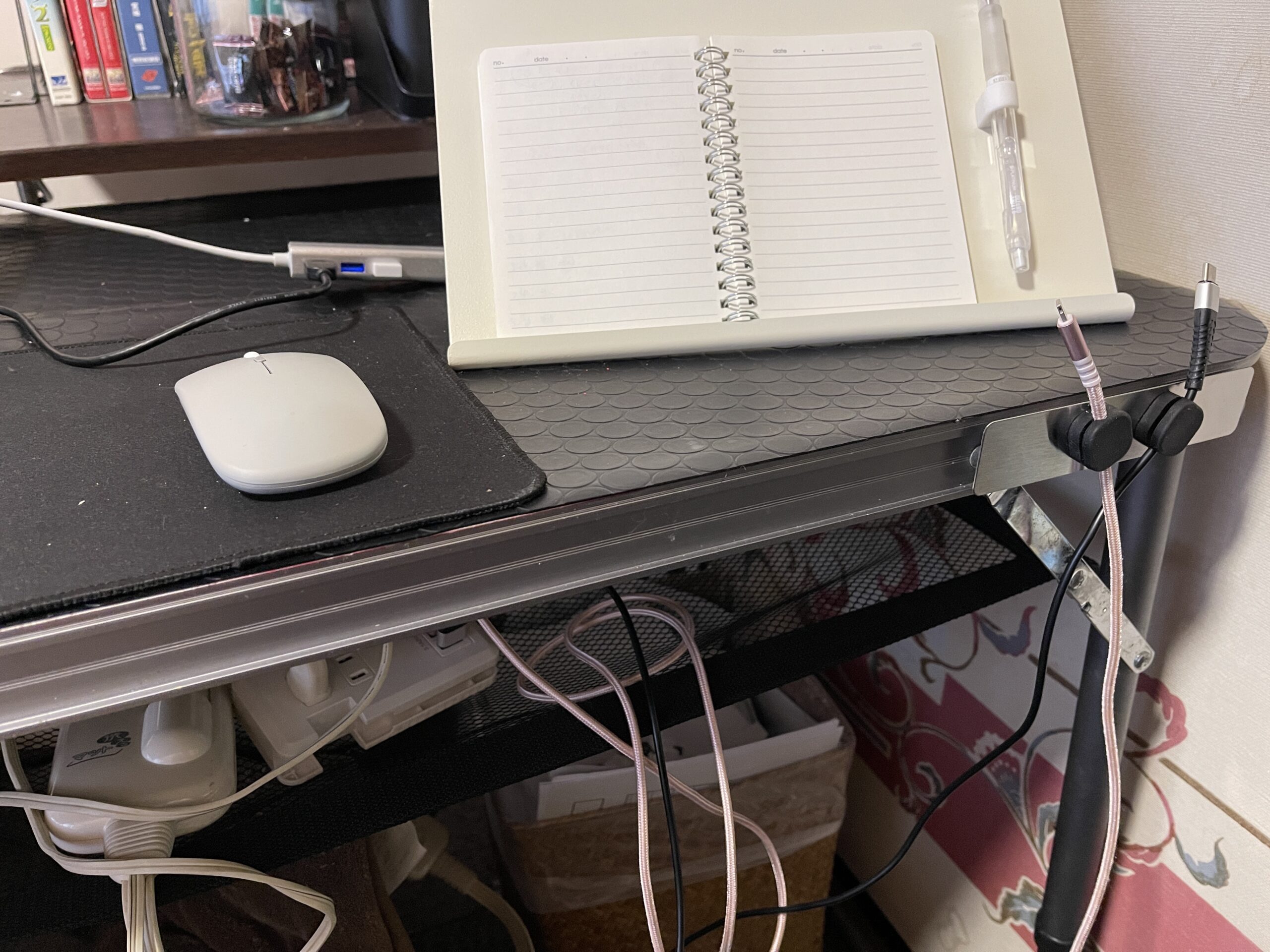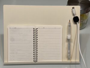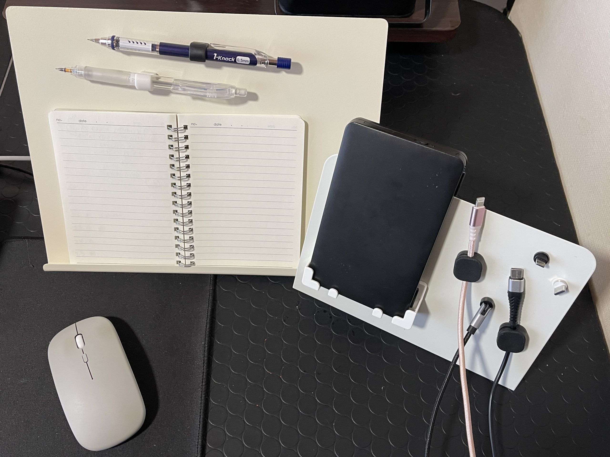 そんなわけで、メモ帳やスマホ、ケーブルまわりをスッキリ使いやすく、見やすく整理でき、作業環境が改善しました