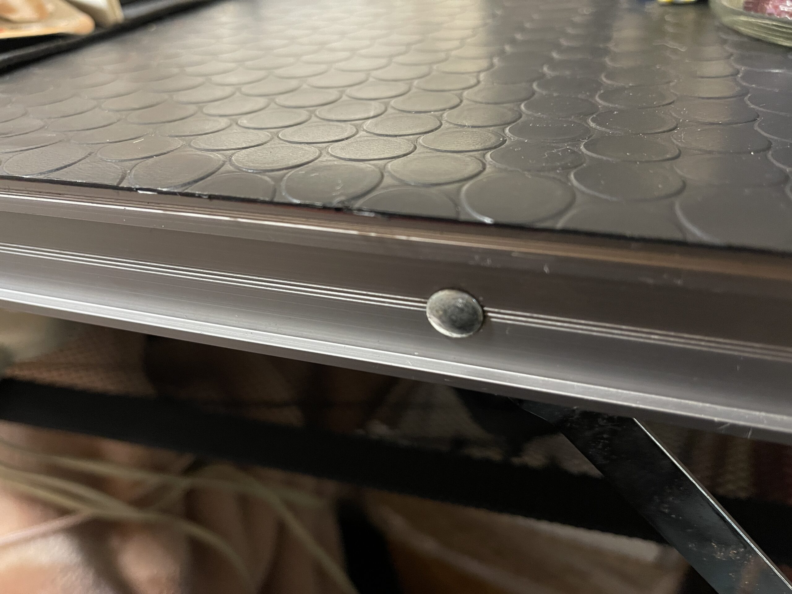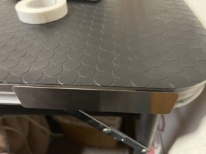 アウトドアテーブル自体は非常に古くて軽く10年以上前に購入したもので、テーブルがハゲハゲになってるので、床材のゴムマットを天板に敷いて使っています