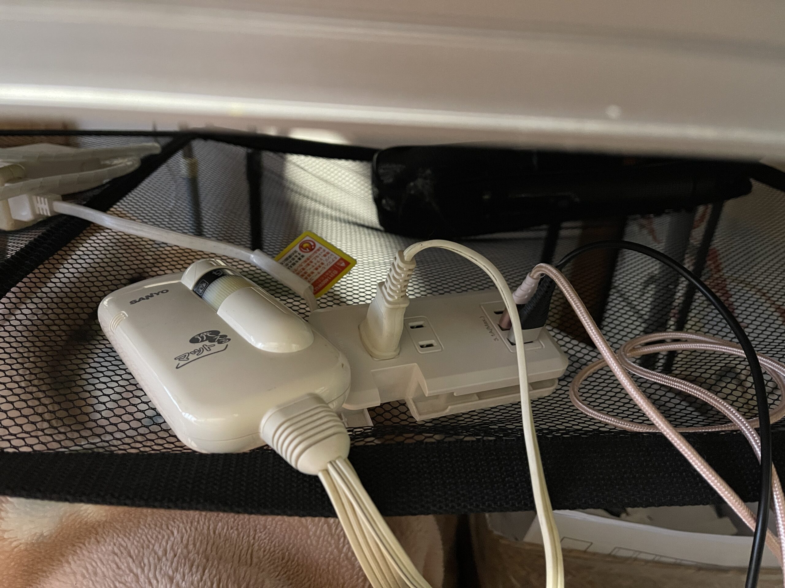 アウトドアテーブルにはネット収納がついてるので、ここにホットカーペットのスイッチやコンセント周りが入れられて便利ですが、今までコードをたどって探すのが手間でした
