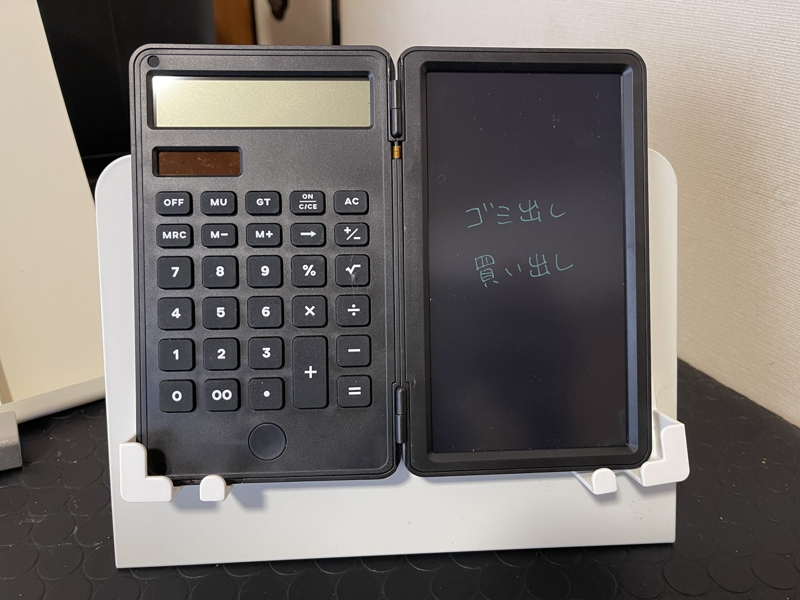 普段はスマホを置いてるのですが、スマホのカメラで撮影するために、仮に計算機を置いてみましたが、大きなサイズのスマホも留める位置次第で対応できるスマホホルダーで優秀です。