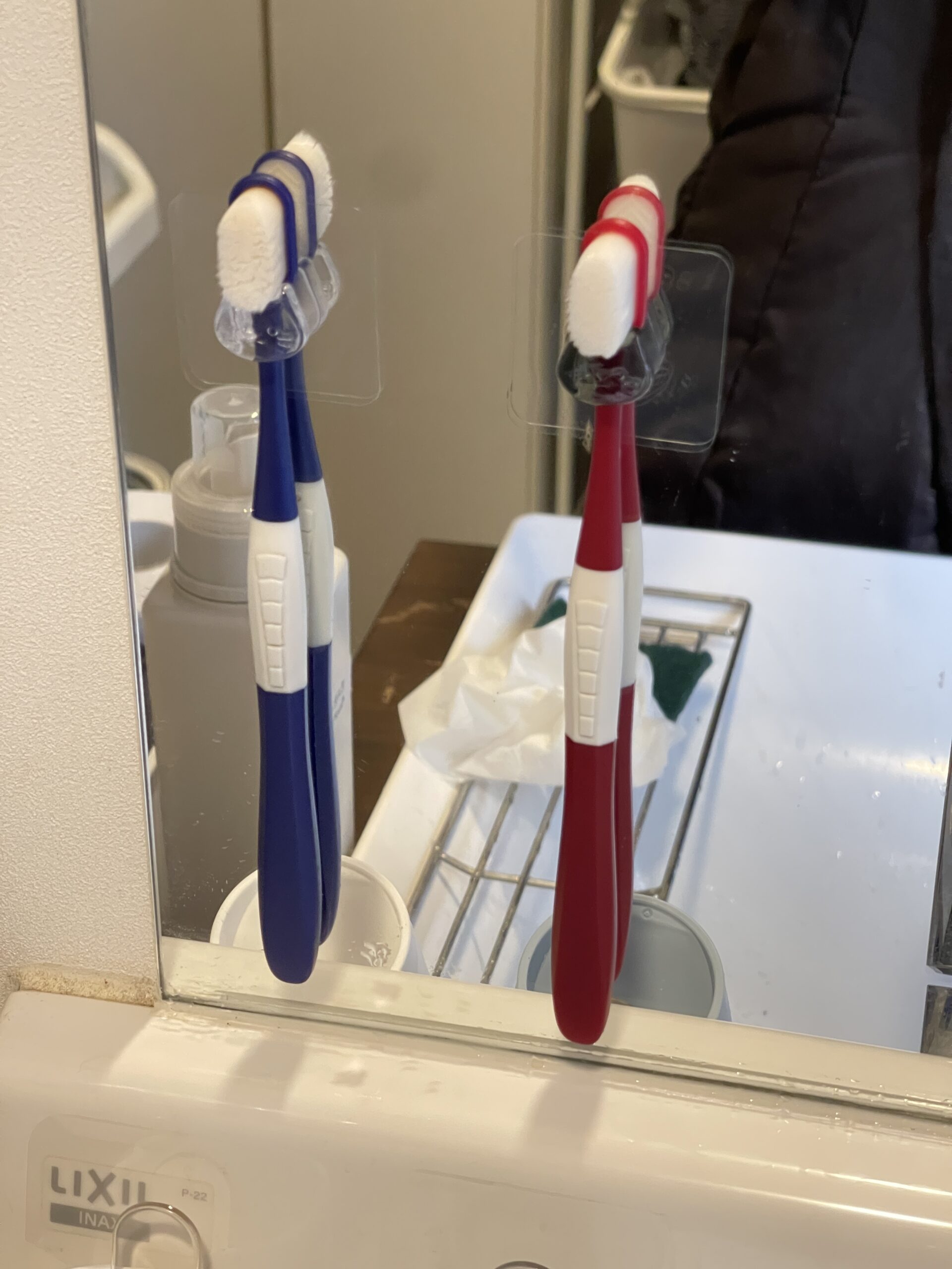 というわけで、めでたく夫の歯ブラシ・コップも洗面台と鏡にくっつけて浮かせる収納になりました
