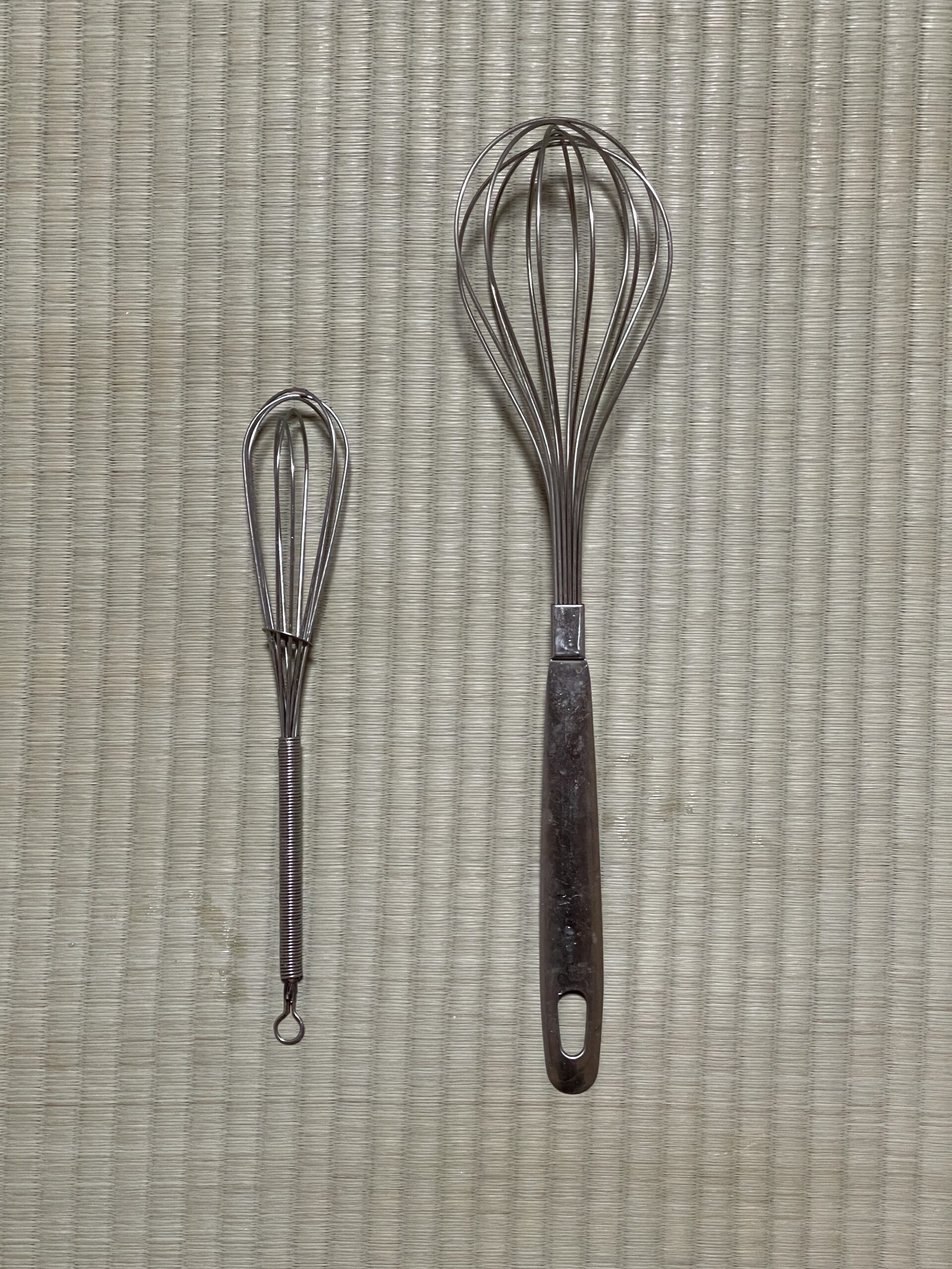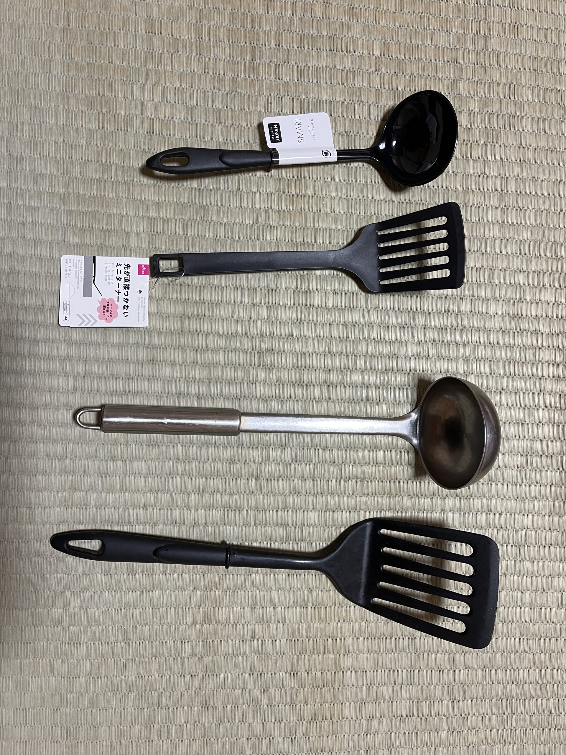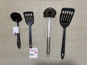 左側のおたま、ターナーが新しく買った物、右側の大きなサイズが今まで使っていたものです