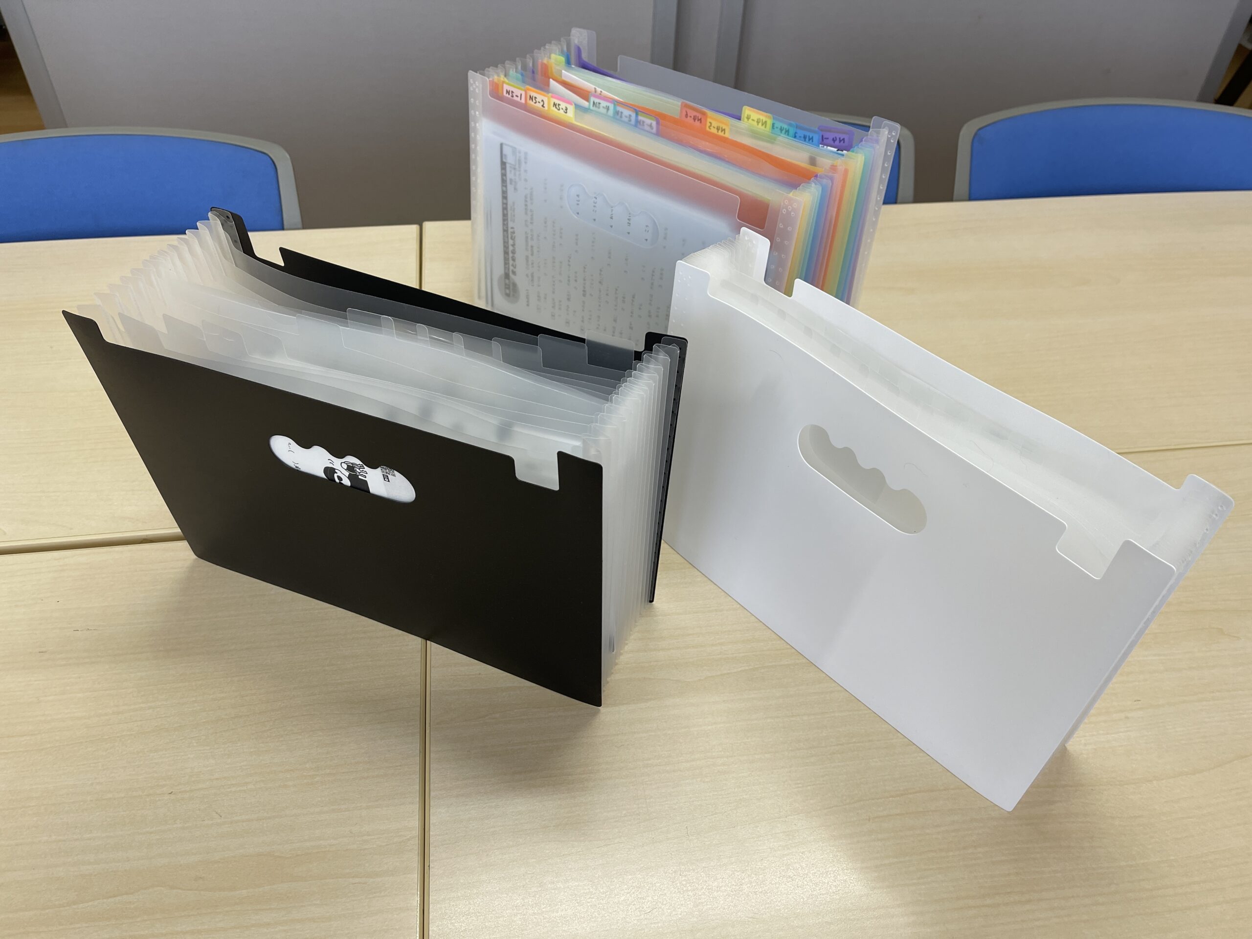黒、白、グレー、カラフル、ファイルごとに色分けして間違えないようにしています。収納力もたっぷり、自立してくれるから、出し入れしやすい