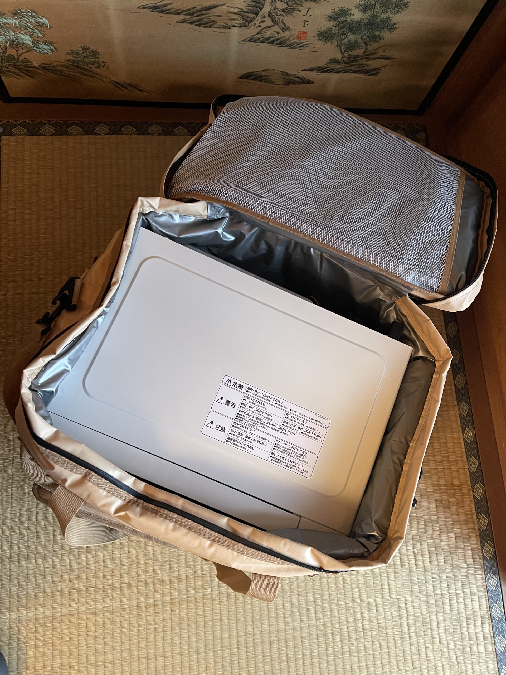 現在車中泊自体をしばらく休止しているというか、車を買い替えてから、未だ車内も準備中で、まだ車中泊で使ったことは無いのですが、やはり電子レンジは巨大なので、これとポータブル電源を車載すると軽自動車の車内はかなり逼迫しそうです。