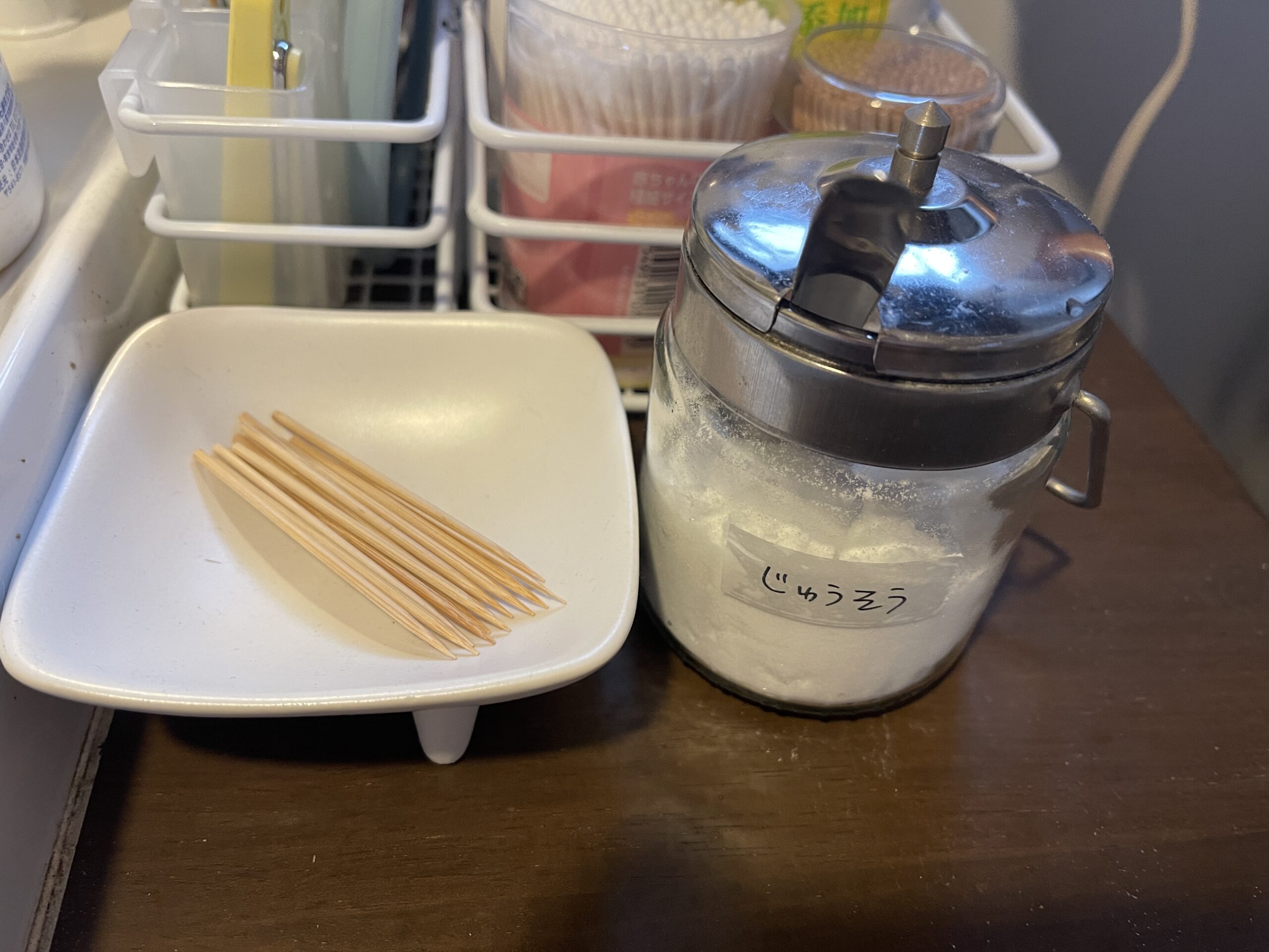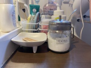 うちの洗面所には、一般的な歯磨き粉(夫用)と、食品グレードの重曹と竹爪楊枝の2種類の歯磨きグッズが置いてあります