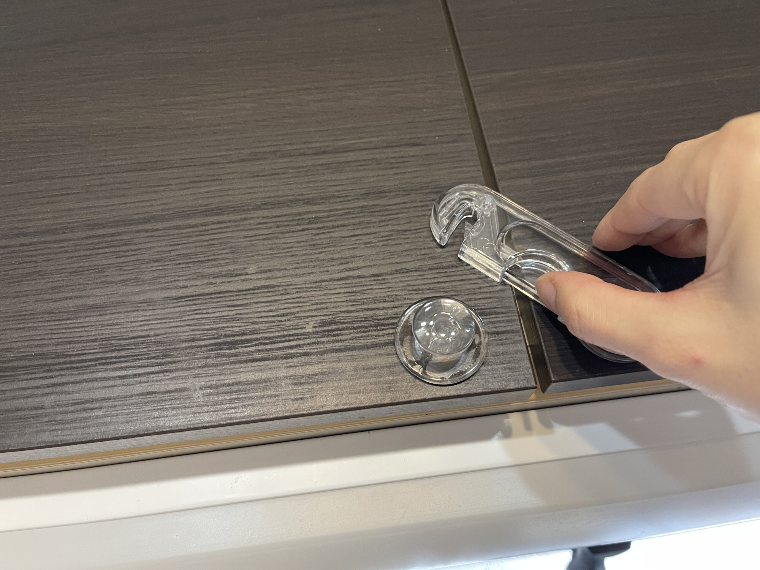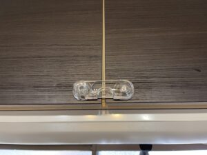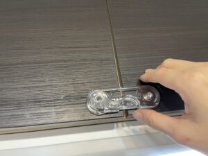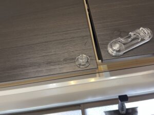 最初から地震対策済みのシステムキッチンだと必要ないと思うのですが、我が家のキッチンの戸棚は対策されていないタイプだったので、こちらにもロックを貼ることにしました