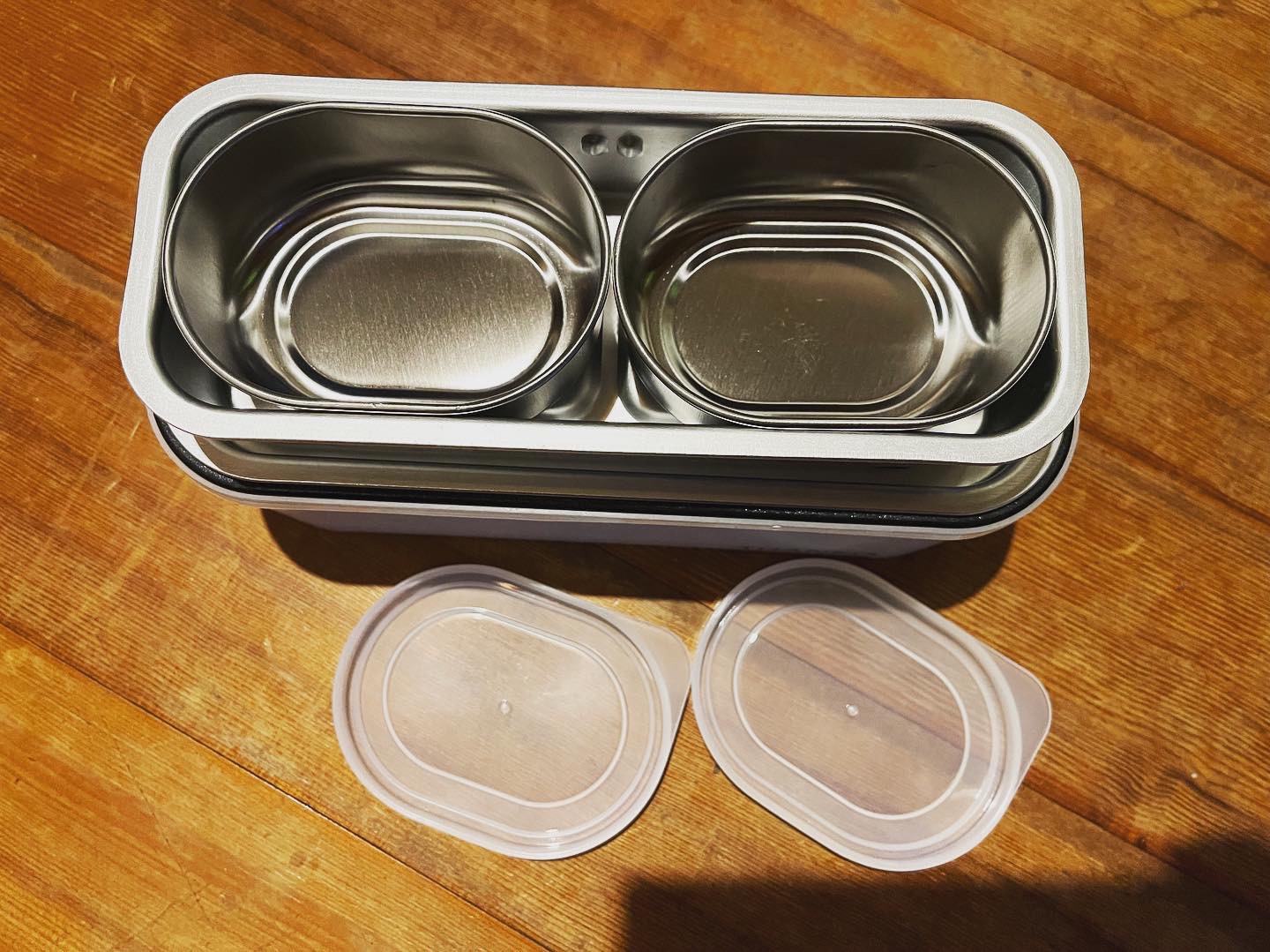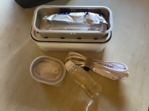 このおかず容器に、お惣菜を入れて、蓋をして持ち運び(蓋をした状態でお弁当箱が閉まります)ご飯を炊く時にはおかず容器の蓋を外して電源オンで良いのです。