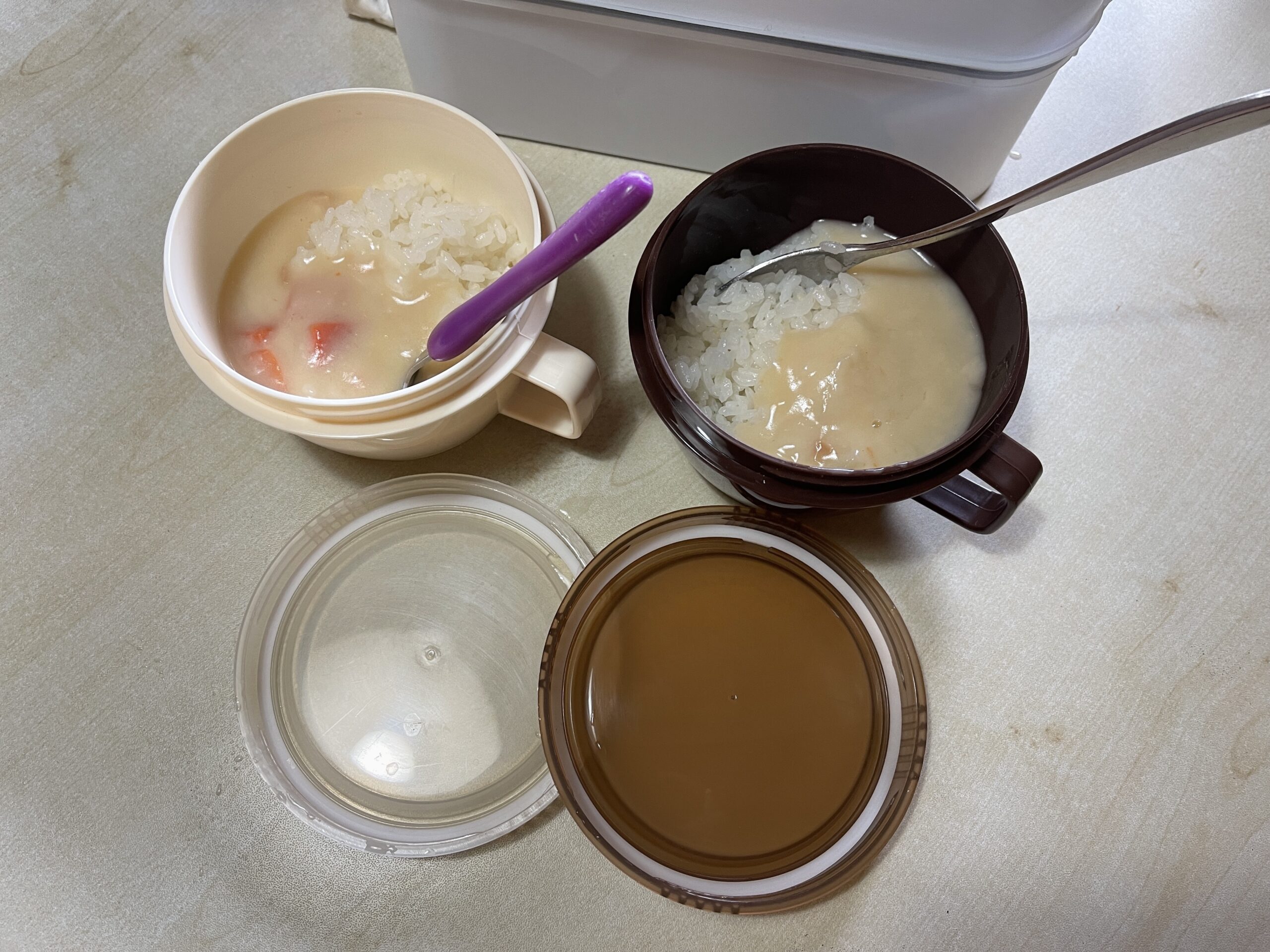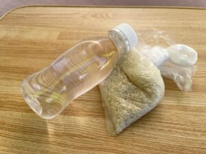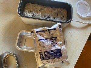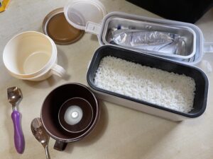 お水をR-1などのヨーグルト容器に130ml、無洗米0.5合でちょうど1人前(母子の場合軽食2人前)になるので、これを同梱しておけば、食べたい時から浸水しても30分ほどで炊きたてご飯となるわけです