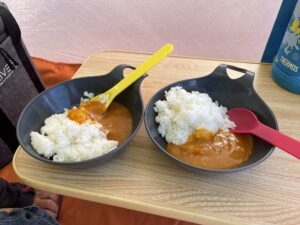 公園に持って行ってカレーを作って食べる親子。ちょっと変態チックでしたが、当日、お昼ご飯がどうなるかわからない時(買って食べるかもしれないとか)レトルトと生米なら保存状態を気にしなくても良いわけなので、必要な時に食べて、不要なときは放置で良い。とても便利。