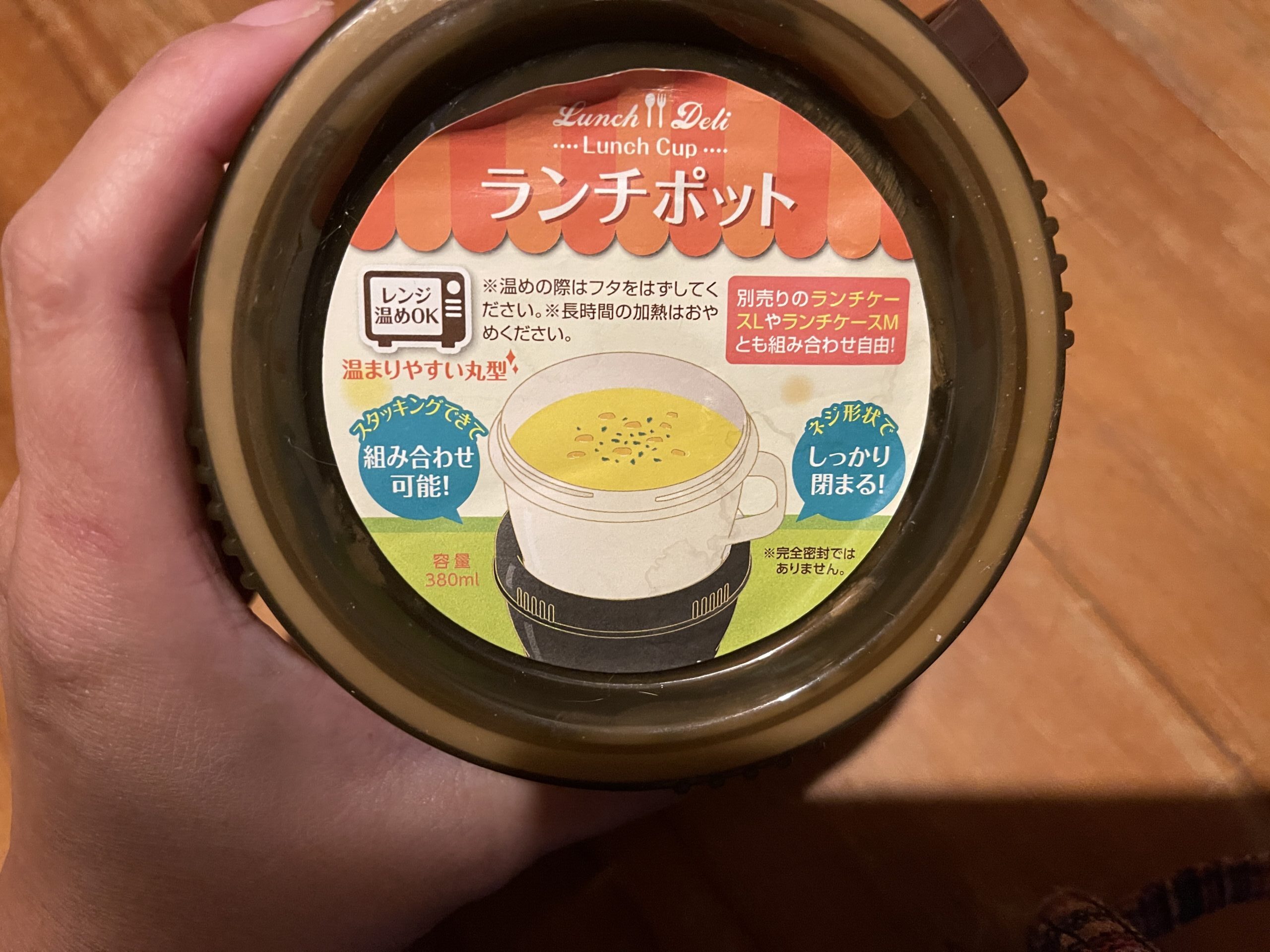 それから改良したのが、このネジ形状の蓋で密閉できる「ランチポット」という100均容器の活用です。普通のお皿に盛ったら、そのお皿を持って帰る容器みたいなのが別に必要になりますが、これだと蓋を閉めるだけで液漏れの心配がなく、持って帰るのに便利です。