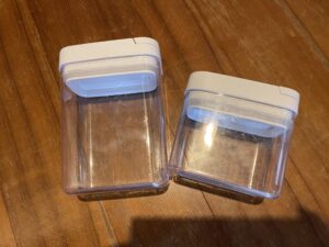 ダイソーで売ってる密閉容器で、水漏れしません。小さい方のサイズで1合くらいまでならお米を浸水させた状態で持ち運べます。