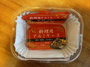 イチオシの容器はこちら。ダイソーなど100均に置いてある料理用アルミケースで40枚入り100円の鬼コスパです。他のものが25枚入りとかに比べて半額くらいのお安さ。これをオカズトレーに2枚入れるとちょうど容器いっぱいになります。